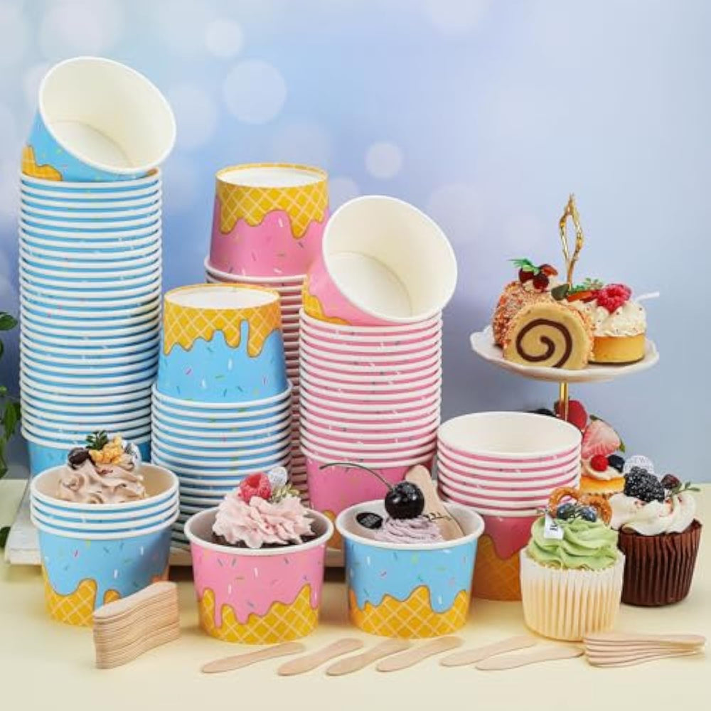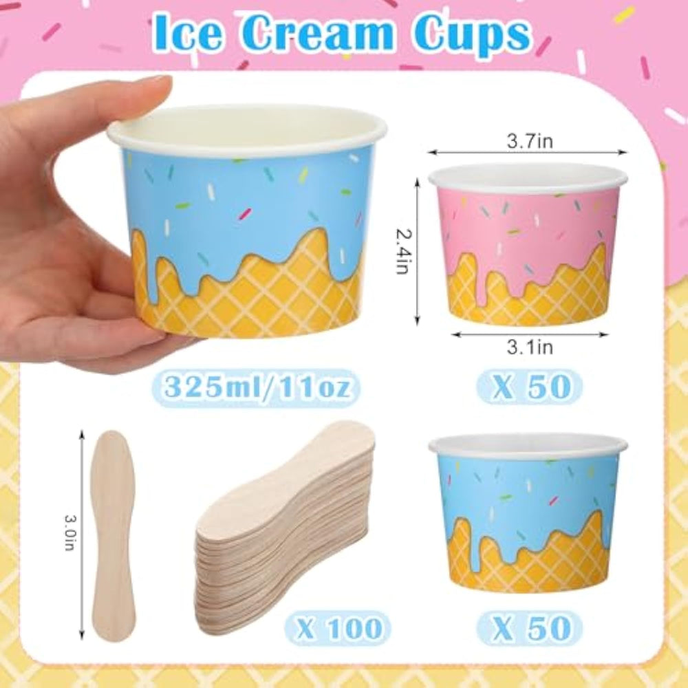 | Ice Cream Themed Set: You Will Receive 100 Ice Cream Bowls And 100 Wooden Ice Cream Scoops; A Sufficient Quantity, Suitable For Large Parties Or Celebrations | | Ice Cream Themed Pattern: Our Ice Cream Set Mainly Includes Two Disposable Paper Bowls, 50 Each Style, Designed With Classic Ice Cream Colors, Suitable For Summer Or Ice Cream Theme Parties | | Material: The 11 Oz Ice Cream Bowl Is Made Of Sturdy Paper Material To Ensure That It Can Hold Desserts Without Leaking Or Deforming; Paired With 3 Inch Wooden Ice Cream Scoops, These Are Alternative To Plastic Products, Allowing You To Enjoy Delicious Food While Protecting The Earth | | Easy To Use: These Disposable Paper Ice Cream Cups Are Designed To Simplify Your Cleanup Work, Suitable For Parties, Events Or Daily Use; After The Event, Just Throw Them In The Recycling Bin For A Hassle-Free Experience, Saving You Time And Energy While Ensuring A Clean Environment | | Versatile: These Disposable Soup Bowls Are Suitable For Summer Parties, Birthday Celebrations, Catering Services Or Ice Cream Shops, Not Only For Ice Cream, Sundae Cups, But Also For Dessert Snack, Yogurt Soup Containers, Salads, Chili, Macaroni, Charcuterie Cup, Etc; Whether It'S Yogurt, Rich Creamy Pudding, Or Fragrant Fruit Salad, These Bowls Can Elegantly Serve All Kinds Of Delicious Food | |