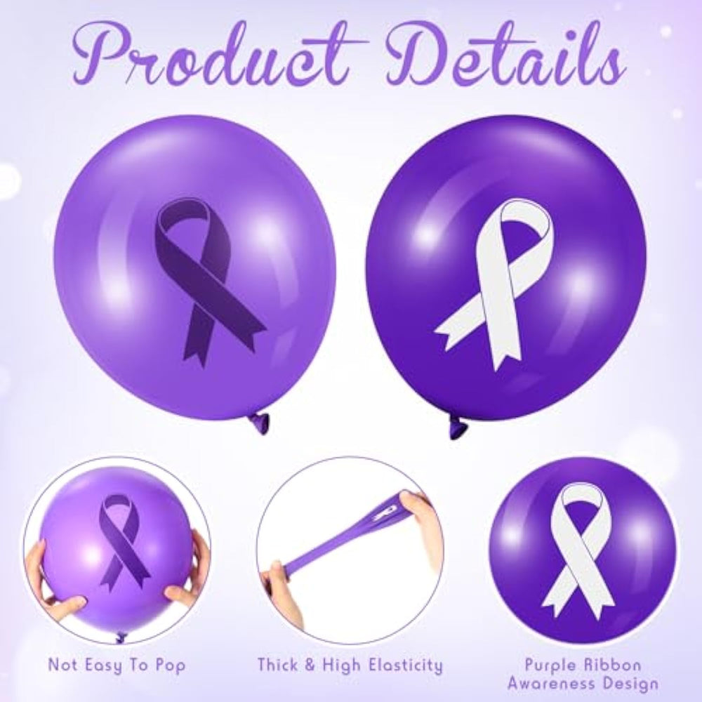 | Purple Awareness: The Ribbon Represents Alzheimer'S, Domestic Violence, Lupus, Overdose Pancreatic Cancer, Crohn'S Disease, Epilepsy, Etc. Through Using These Ribbon Balloons To Raise People'S Awareness For Different Illnesses And Caring About Other People Who Are Sufferring Domestic Violence, Illnesses And So On | | Package Includes: The Package Includes 50 Pieces Of Light Purple Balloons With Dark Ribbon Pattern, And 50 Pieces Of Dark Purple Balloons With White Ribbon Pattern, 100 Pieces In Total, Sufficient Quantity To Meet Your Daily Use | | Quality Material: The Pancreatic Cancer Balloons Are Made Of Latex Material, Elastic And Reliable To Use, Not Easy To Fade Or Break, So You Can Easily Inflate Them, Safe To Support Domestic Violence, Lupus, Overdose Pancreatic Cancer, Alzheimer'S Awareness Theme Party Activities; Note: Please Don'T Overfill To Avoid Bursting Or Rub Against Overheated And Sharp Objects To Avoid Sudden Popping | | Easy To Use: Just Blow The Balloons, After Inflation, You Can Gently Rub Them On A Wool Blanket Or Hair To Generate Static Electricity, So That The Sequins Stick To The Inner Surface Of The Balloon, With The Additional Balloon Chains And Glue Point Stickers, You Can Easily Make A Balloon Arch | | Various Occasions: The Ribbon Balloons Can Be Applied At Marches, Parties, Memorials, Themed Projects, Survivor Party, Charitable Activities, Fundraisers, Domestic Violence Awareness Month (Dvam) And Other Charitable To Arousing People'S Awareness Of The Different Diseases, Such As, Epilepsy, Alzheimer'S/Dementia, Pancreatic Cancer And Providing Support For Victims And Advocates | |