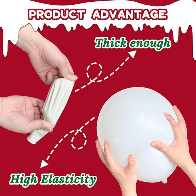 This Christmas balloon set includes 100 balloons in red, green, and white, each measuring 12 inches, along with 2 rolls of balloon ribbon. Each balloon weighs 2.8 grams, providing enough quantity for all your holiday or party decoration needs. Made from high-quality latex, these balloons are thick, durable, non-toxic, and safe for children. They can be filled with air or helium and are easy to inflate without easily popping. The classic red and green color combination creates a festive Christmas atmosphere, while the addition of white adds a touch of elegance. Perfect for decorating Christmas parties, birthdays, holiday gatherings, or festive photo backdrops, these balloons help create a cheerful and memorable celebration.