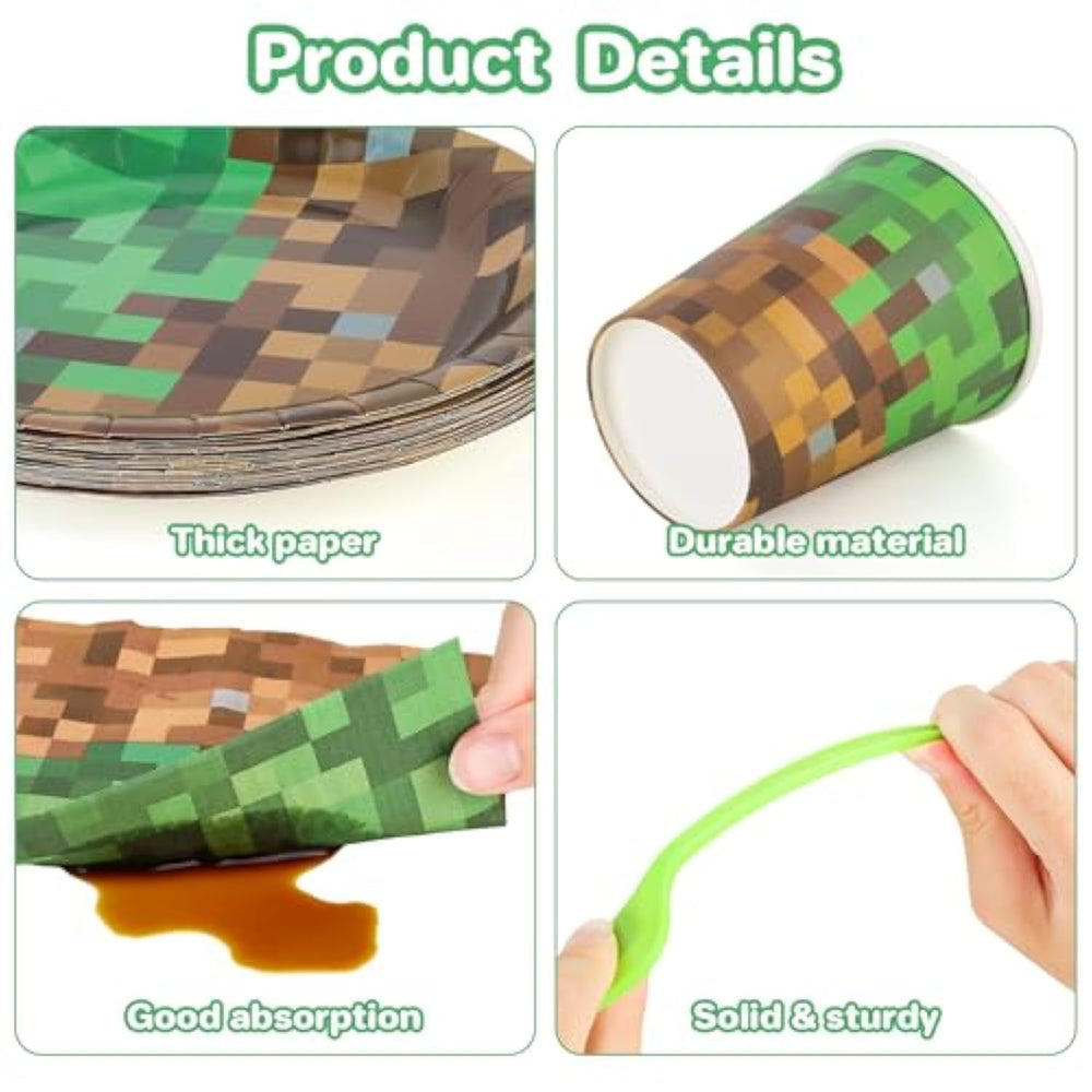 | Complete Set: Package Includes Plates, Cups, Napkins, And Forks For 20 Guests - Total Of 100 Pieces For A Fully Coordinated Pixel-Themed Party Setup | | Pixel Design: Features Classic Pixelated Dirt And Grass Block Pattern In Brown And Green Colors, Perfect For Gaming Enthusiasts And Themed Celebrations | | Party Pack Contents: Set Includes 7" And 9" Plates, 9 Oz Cups With Coordinating Pixel Design, Matching Napkins, And Green Plastic Forks | | Convenient Sizing: Large 9" Plates Perfect For Main Course, Smaller 7" Plates Ideal For Desserts And Appetizers, Standard 9 Oz Cups Suitable For Various Beverages | | Party Planning: Serves 20 Guests Comfortably With Coordinated Tableware Pieces, Making Party Setup And Cleanup Quick And Easy | |