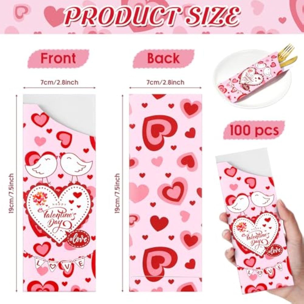 | Large Quantity: You Will Receive 100 Flatware Paper Bags, A Large Quantity That Allows You To Replace The Use At Any Time, To Meet Your Daily Needs, You Can Also Share To Others To Use | | Suitable Size: Each Utensil Holder For Party Measures Approximately 7.5 X 2.8 Inches/ 19 X 7 Cm And Fits Most Standard Size Silverware And Cutlery, Such As Knives, Spoons And Forks, To Make Your Meals With Your Family More Enjoyable | | Durable Material: The Valentine'S Day Party Decor Is Made Of Offset Paper With A Smooth Surface, Featuring 120 Gsm, Strong, Durable, Lightweight, Not Easy To Tear Or Fade, Suitable For Most Tableware, Disposable Silverware Pocket Will Provide You With A Good Experience, Adding Elegance To Your Valentine'S Day Decoration | | Valentine'S Day Theme: The Silverware Bag Is Designed With The Heart Pattern And The Bird Pattern With The Valentine'S Day Elements, Which Fits The Valentine'S Day Theme And Is Sure To Make Every People Praise Your Party Decoration Ideas | | Classic Look: This Valentine'S Day Themed Silverware Bag Adds A Lovely Look To Your Valentine'S Day Party Supplies And Is A Nice Choice For Boys And Girls, Valentine'S Day Parties Or Other Occasions And Events | |