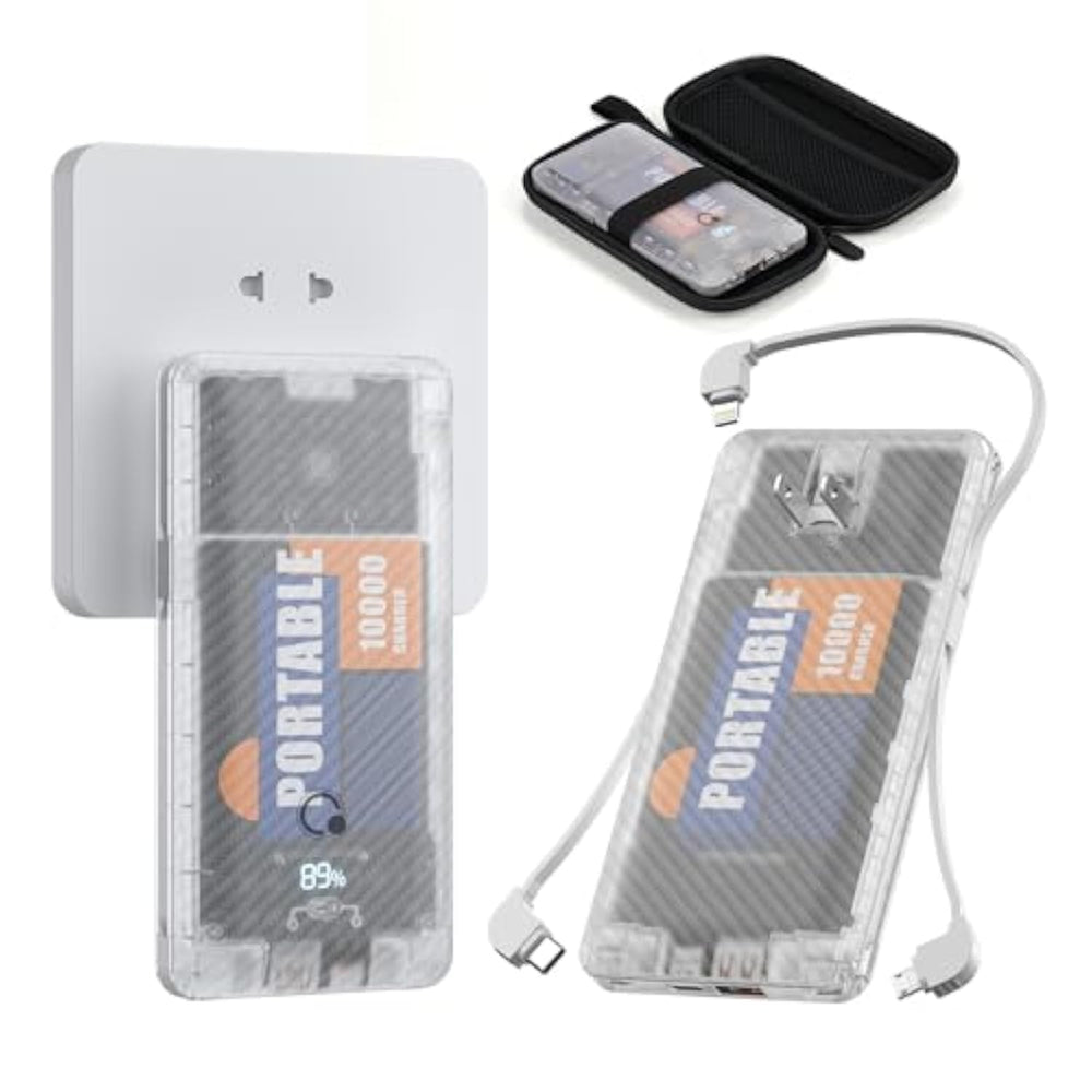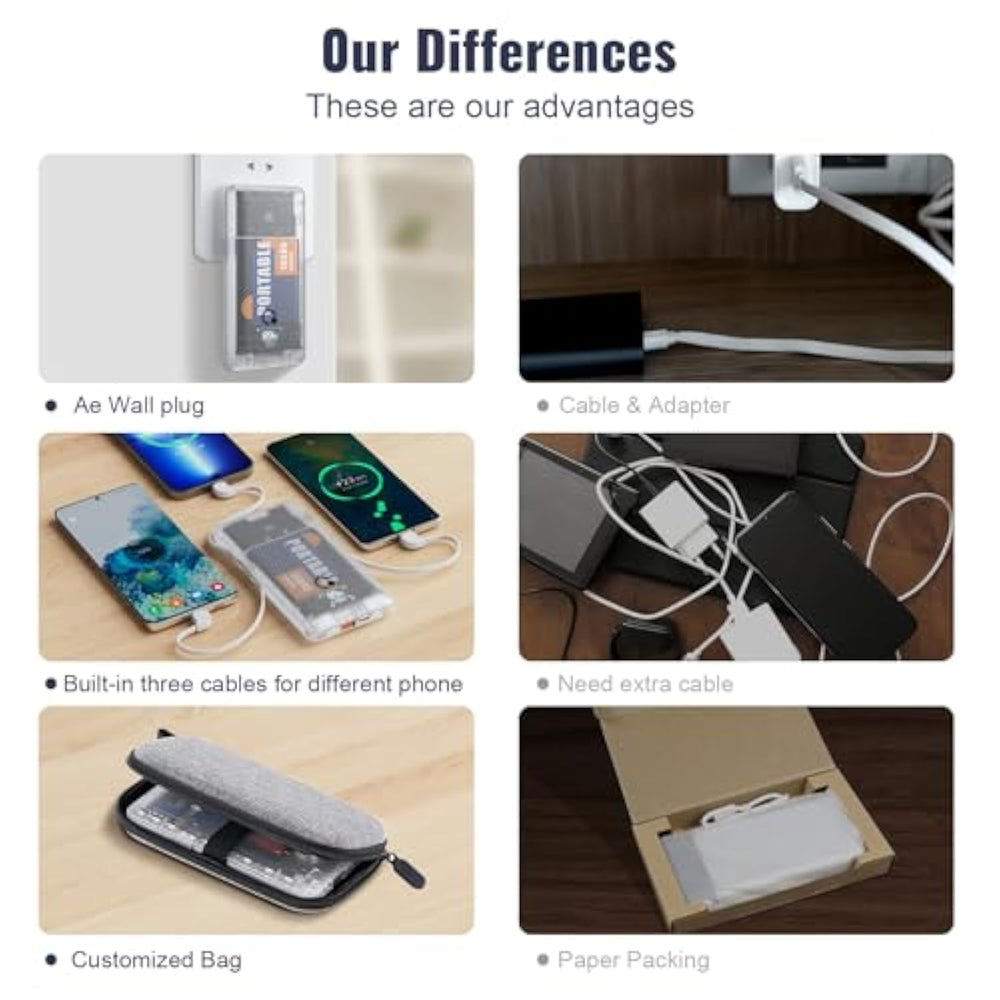 | [6 in 1 Portable Charger with built in cable]:Built-in three cables for different types of cell phone directly,no need take charging cable,built-in AC wall plug fast charge,so when you outside ,only take this portable charger is OK ,no need other cables and adapter.the USB C port support input and output. | | [Slim Portable Power Bank Charger]The slim and handy 10000mAh high capacity battery with 6 in 1 compact design is easy to carry, have USB C 20W ,when the Usb port or USB C port or the built in Usb C cable use alone support 20W .if use together will share.extremely convenient for travel and daily use in charging electronic devices mobile phones, cameras and tablets. | | [Slim and Compact size Portable Phone Charger with Digital battery Display]:Q Portable Phone Charger dimension is 5.9*2.8*0.55inch, which make it easier to carry, will not give you too much trouble when carrying out. Stay informed about your power bank's battery status with the easy-to-read digital display. This intuitive feature lets you know exactly how much power is remaining, so you can plan your charging needs accordingly | | [Two Ways To Charge The External Battery Pack]the first way use the built –in AC wall plug for recharge the battery pack will easy,the second way use the Usb C charging cable and adapter(not include) to charge the power bank,suggest the fist way more convenience. UL2056 certificate. Intelligent power management IC provides power short circuit protection, over current protection, over voltage and over heat protection to ensure safe charging | | [Travel-Friendly Design with Portable Carrying Case Power Bank]: This power bank comes with a portable carrying case. Its compact size and lightweight construction make it the perfect companion for your travels, ensuring you have reliable power wherever you go. Additionally, using the built-in AC plug, providing you with a quick turnaround time and minimal downtime between charges. | |