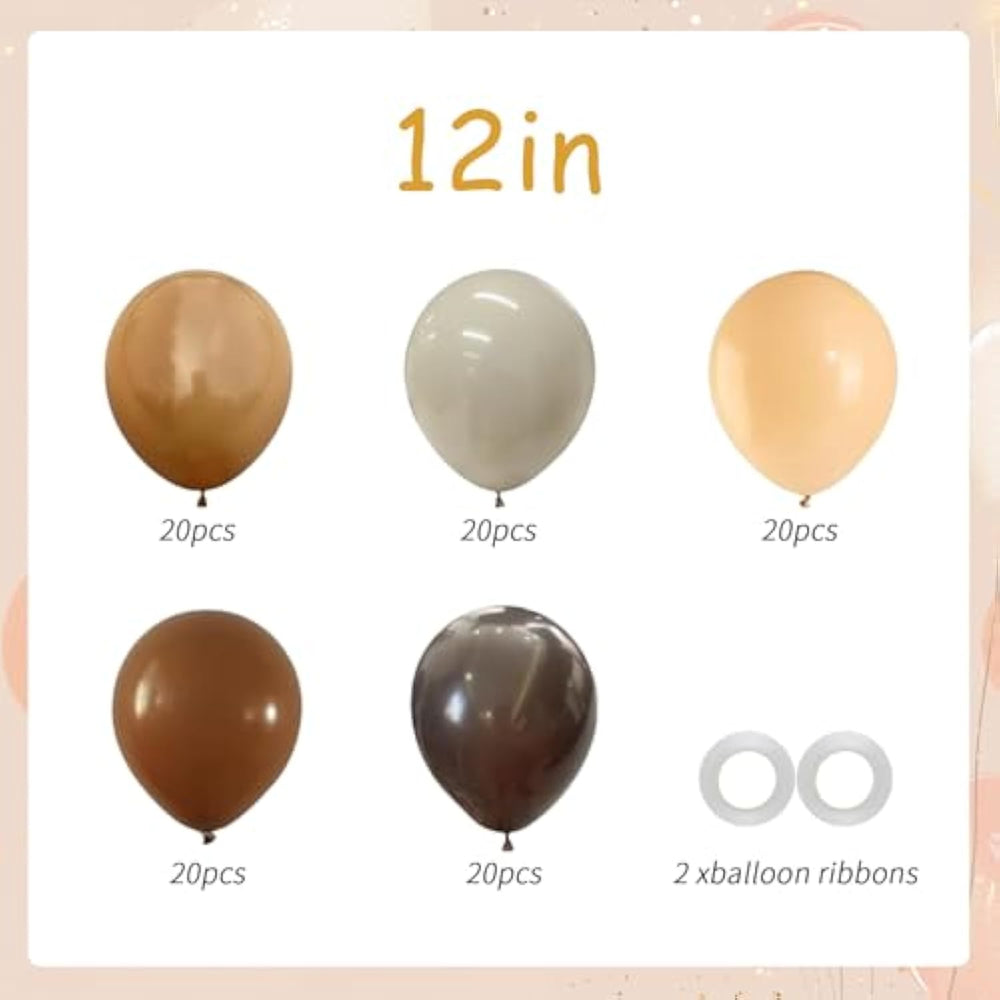 | 100-Piece Brown Balloon Bundle Includes 20 Retro Brown, 20 Tan, 20 Coffee, 20 Sand White, And 20 Chocolate Balloons With 2 Ribbons (66Ft Total) – Perfect For Neutral-Themed Baby Showers, Safari Weddings, Or Cowboy Graduation Parties. | | Premium Eco-Friendly Latex Ensures Durability For Helium/Air Inflation, While Non-Toxic Materials Make Them Safe For Kids’ Birthday Parties Or Indoor/Outdoor Celebrations. | | Rich Earthy Tones Blend Dark Brown, Beige, And Cream Hues To Create Bohemian Backdrops, Woodland Centerpieces, Western Themed Décor Or Elegant Bridal Décor – Effortlessly Complements Rustic Or Modern Aesthetics. | | Perfect For Any Theme: Versatile Neutral Color Scheme Ideal For Holidays Like Christmas, Valentine’S Day, Or Halloween – Transforms Spaces Into Cozy Autumn Gatherings Or Sophisticated New Year’S Eve Events In Minutes. | | Warm Tips:Don'T Blow Them Up By Your Mouth, More Efficient Way Is Use A Balloon Pump For Quick Inflation. Please Do Not Overfill Or Overheat And Avoid Sharp Objects. | |