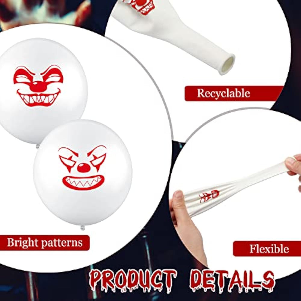 Add a creepy twist to your Halloween party with our Scary Clown Balloon Set. This pack includes 100 latex balloons in two sinister designs—50 of each—featuring ferocious clown faces printed in bold red on a white background. Made from high-quality latex, these balloons are durable, elastic, and resistant to fading or leaking, ensuring they last through your entire celebration. Each balloon inflates up to 12 inches, making them large enough to catch the eye and set the tone for a spine-chilling atmosphere. Perfect for decorating living rooms, backyards, classrooms, bars, or stages, these clown balloons pair well with banners, backdrops, or other Halloween props. Whether used for parties, haunted houses, or trick-or-treat setups, they deliver just the right mix of creepy fun and unforgettable fright.