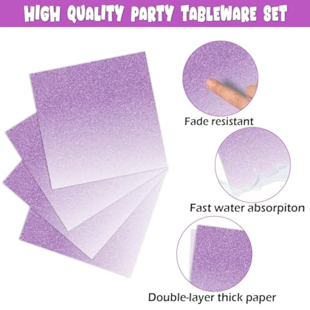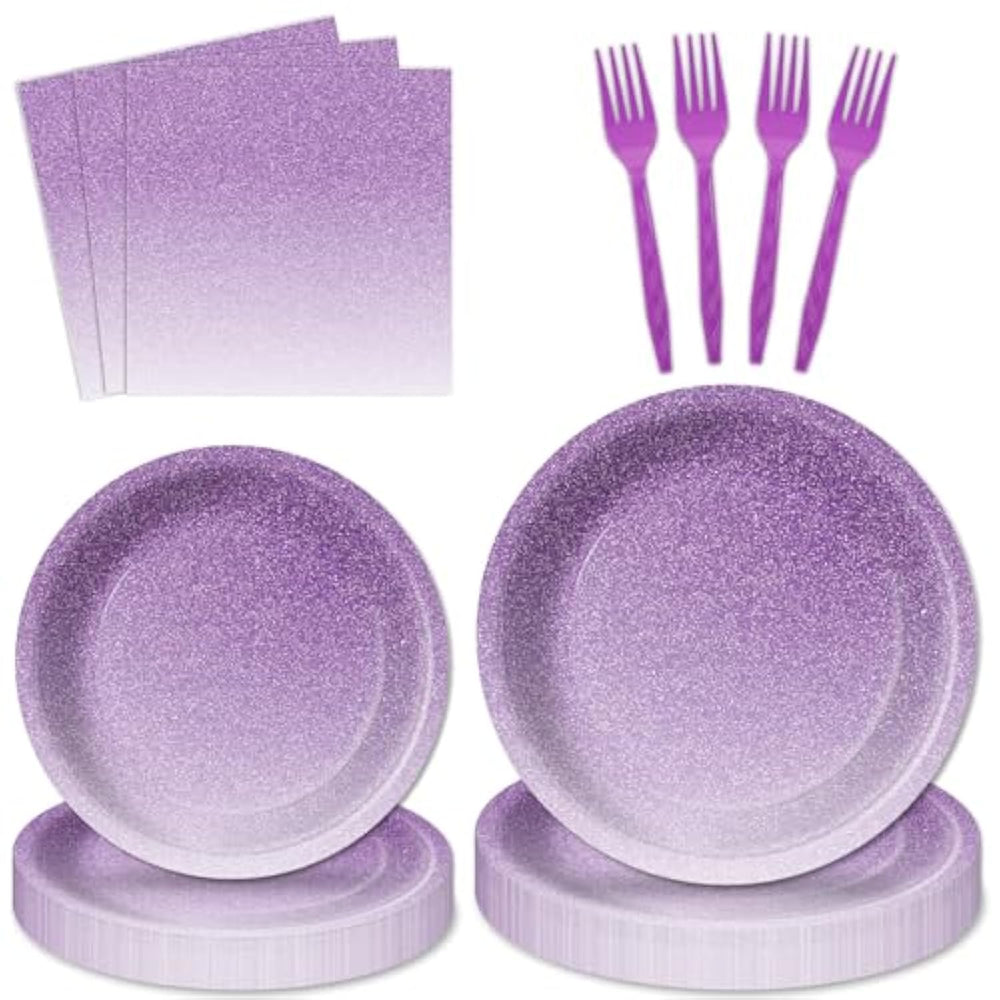 | Package Includes: The Ombre Purple Tableware Sets Include 25 9" Light Purple Plates, 25 7" Purple Paper Plates, 25 6.5”Purple Napkins, And 25 Purple Forks, Each Set Is Sufficient To Serve Up To 25 Guests. | | Safe And High-Quality Materials: Our Gradient Purple Plates And Napkins Decorations Are Made Of High-Quality Paper That Is Not Easy To Bend, Tear And Fade. Featuring Odourless, Heat-Resistant, Non-Toxic, Durable And More, You Can Confidently Use Our Baby Shower Theme Party Set To Create The Most Enjoyable Party For Your Friends And Family. Please Do Not Heat The Paper Plate. | | Bright Patterns And Designs: This Light Purple Party Supplies Is Beautifully Designed, Using Bright Patterns And Bright Colors, Incorporating Purple Gradient Themed Elements, It Is Perfect For Your Purple Birthday Party, Leaving Fun Memories For Your Party. | | Wide Range Of Application: This Purple Birthday Plates Decorations Is Ideal For All Kinds Of Parties And Can Be Applied To Baby Shower, Bridal Shower, Birthday Parties, Anniversaries, Girls' Party,Weddings And More. | | Easy To Clean Up, Save Time: This Disposable Lilac Lavender Tableware Is Disposable And You Can Throw It Directly Into The Trash After The Party, Allowing You To Complete The Cleaning Process Quickly And Easily, Saving Your Post-Party Cleaning Time And Better Enjoying Your Party Time With Family And Friends. | |