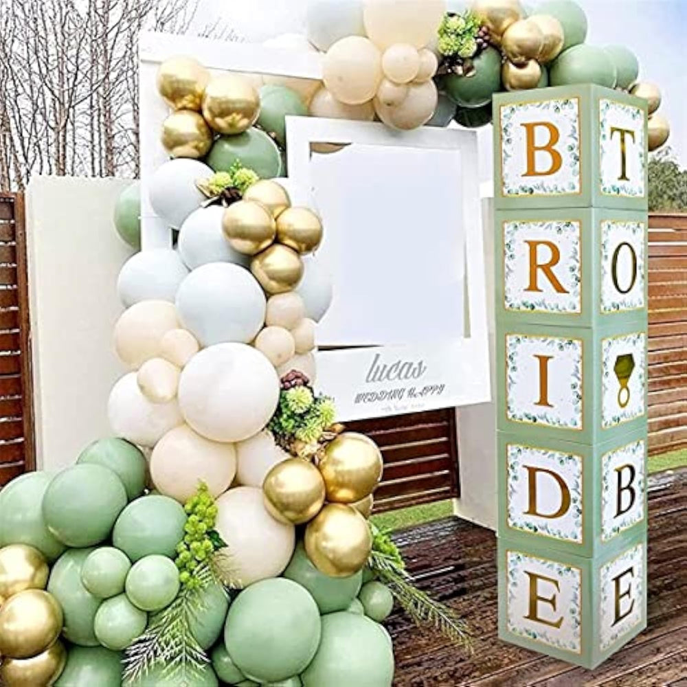 Make any celebration unforgettable with this all-in-one greenery and gold bridal shower décor kit. Perfect for engagement parties, bachelorette events, or rehearsal dinners, it adds a touch of elegance and charm to any space. The set includes 5 decorative boxes, 45 balloons in gold, sage green, nude, and white, plus 51 easy-stick letters including “BRIDE,” “TO BE,” “GROOM,” and the full A–Z alphabet to customize any name or message. Crafted from premium, non-toxic materials, the sturdy boxes and thick 10" balloons are made to last. Easy to assemble with pre-folded boxes and a visual guide, this kit takes the stress out of decorating—reuse it for future events or pass it along to a friend!