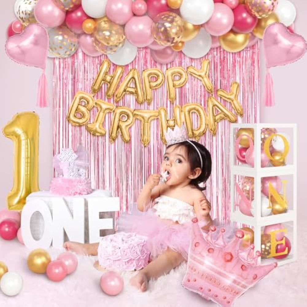 Celebrate your baby girl’s first birthday in style with this all-inclusive decoration set. It includes everything you need to create a memorable and fun party atmosphere, featuring 1 pink fringe curtain, a "one" foil balloon, heart-shaped foil balloons, a "happy birthday" foil balloon, and a variety of balloons in pearlescent pink, gold, rose red, and white, plus 10 gold confetti balloons for that extra sparkle. The set also comes with 3 baby boxes, two sets of "one" letters, pink paper tassels, and four balloon tools to help you create a beautiful display. With balloon arch strips, a tying tool, ribbon, and 100 glue points included, you’ll have everything necessary to create an eye-catching pink balloon garland. Designed for ease of use, this kit ensures you can set up in just 30 minutes, leaving you more time to enjoy your special day and less time worrying about decorations.