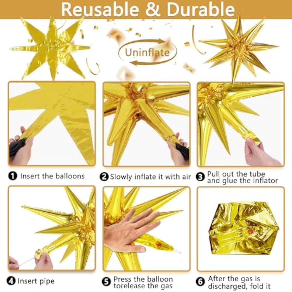 This 101-piece navy blue and gold balloon arch kit includes a mix of 99 balloons in 5, 10, 12, and 18 inches, plus two reusable 22-inch gold explosion star balloons. The set also comes with a dot glue, balloon strip, and ribbon for easy assembly. Perfect for birthdays, weddings, anniversaries, and celebrations of all ages, this navy blue and gold decoration adds a stylish touch to any event. Made from high-quality, thick latex, the balloons are durable and long-lasting. Inflate to 85% for best results and pinch the inflation inlet of the explosion star balloons flat after filling.