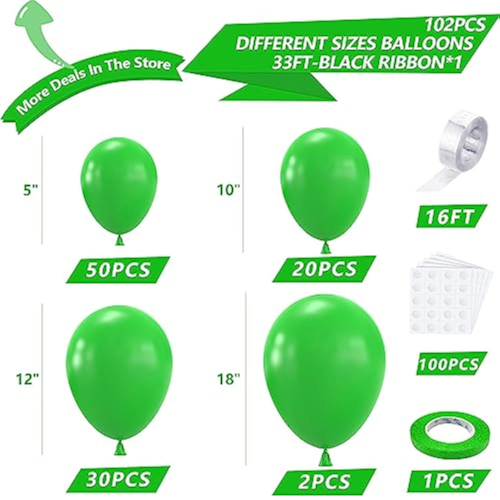 This upgraded 102-piece green balloon kit is made from premium natural latex, ensuring durability and safety for both children and adults. Thicker than regular balloons, they are less likely to burst and can be treated with Balloon Shine Spray for a lasting glossy finish. The set includes 102 green balloons in various sizes, along with 100 glue dots, a 16-foot balloon strip, and a 33-foot green ribbon for easy assembly. Perfect for birthdays, baby showers, jungle or dinosaur-themed parties, and other celebrations, these balloons can be combined with different colors for a unique look. Inflate with helium or air, attach using the provided strip and glue dots, and create a stunning DIY balloon garland while ensuring they are not overfilled to prevent popping.
