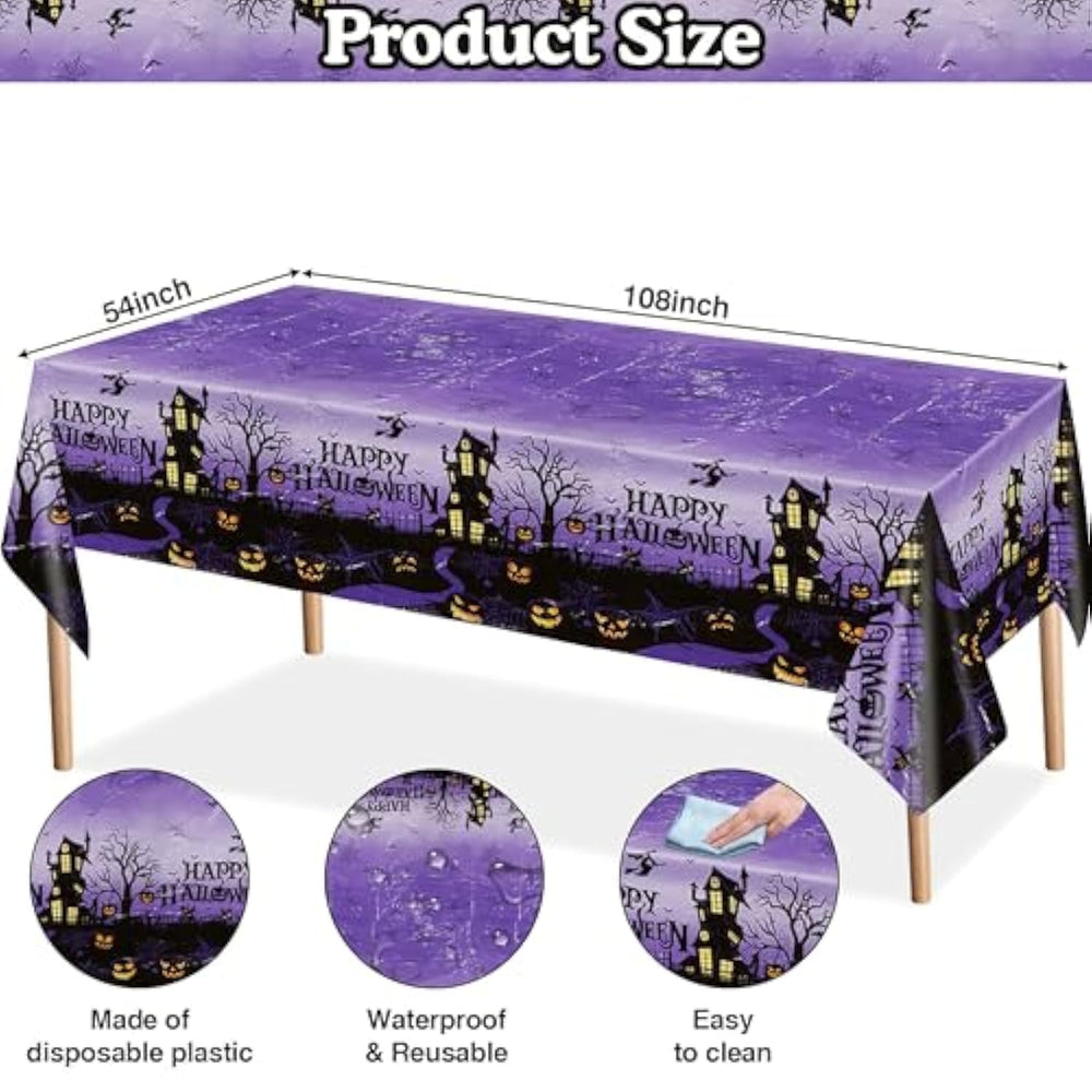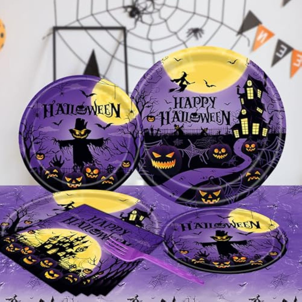 Elevate your spooky celebration with our Complete Halloween Decoration Party Set, thoughtfully designed to serve up to 25 guests and create a festive atmosphere with ease. This all-in-one kit includes a bold “Happy Halloween” banner, 25 large 9-inch plates, 25 small 7-inch plates, 25 absorbent 6.5-inch napkins, 25 sturdy purple forks, and a PE plastic waterproof tablecloth (54 x 108 inches) that ties everything together. Featuring eye-catching Halloween patterns of witches, pumpkins, and spider webs, the set instantly transforms any space into a festive gathering spot. Made from durable, high-quality paper and plastic materials, the plates and napkins are strong enough to hold your party treats, while the forks provide reliable use and the tablecloth ensures protection against spills. Best of all, everything is disposable for quick, hassle-free cleanup, allowing you to enjoy the celebration without the post-party mess. Perfect for Halloween parties, school events, haunted house gatherings, and family dinners, this kit delivers both style and convenience in one complete package.