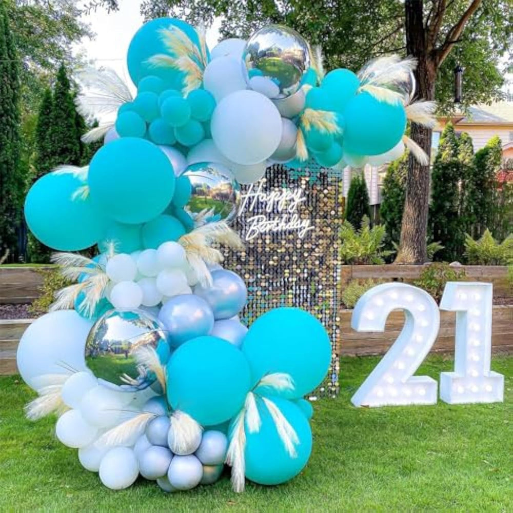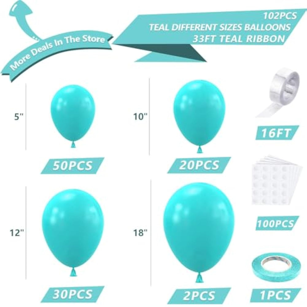 This upgraded 102pcs teal balloon kit features premium natural latex balloons that are durable, non-toxic, and thicker than regular balloons, ensuring they are less likely to burst. The set includes 2pcs 18-inch, 30pcs 12-inch, 20pcs 10-inch, and 50pcs 5-inch turquoise balloons, along with 100 glue dots, a 16ft balloon strip, and a 33ft teal ribbon for easy assembly. Perfect for birthdays, graduations, baby showers, gender reveals, weddings, and more, this teal balloon arch kit adds a vibrant touch to any celebration and can be paired with other colors for a unique party setup.