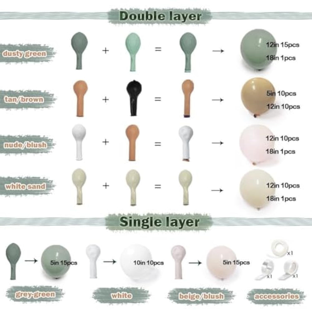 This dusty green and nude balloon garland kit includes a beautiful mix of double-stuffed blush beige tan brown dusty green and pastel white balloons that create a soft neutral color palette perfect for baby showers weddings or any elegant celebration. The set contains various balloon sizes including 12 and 18 inch nude blush balloons 5 12 and 18 inch apricot tan and brown balloons 12 and 18 inch cream and white sand balloons 5 and 12 inch avocado green and dusty green balloons 10 inch pastel white balloons and 5 inch retro blush and beige balloons. It also comes with balloon strip tape glue dots and white ribbon to help you easily assemble a full and eye-catching garland display for a memorable party setup.