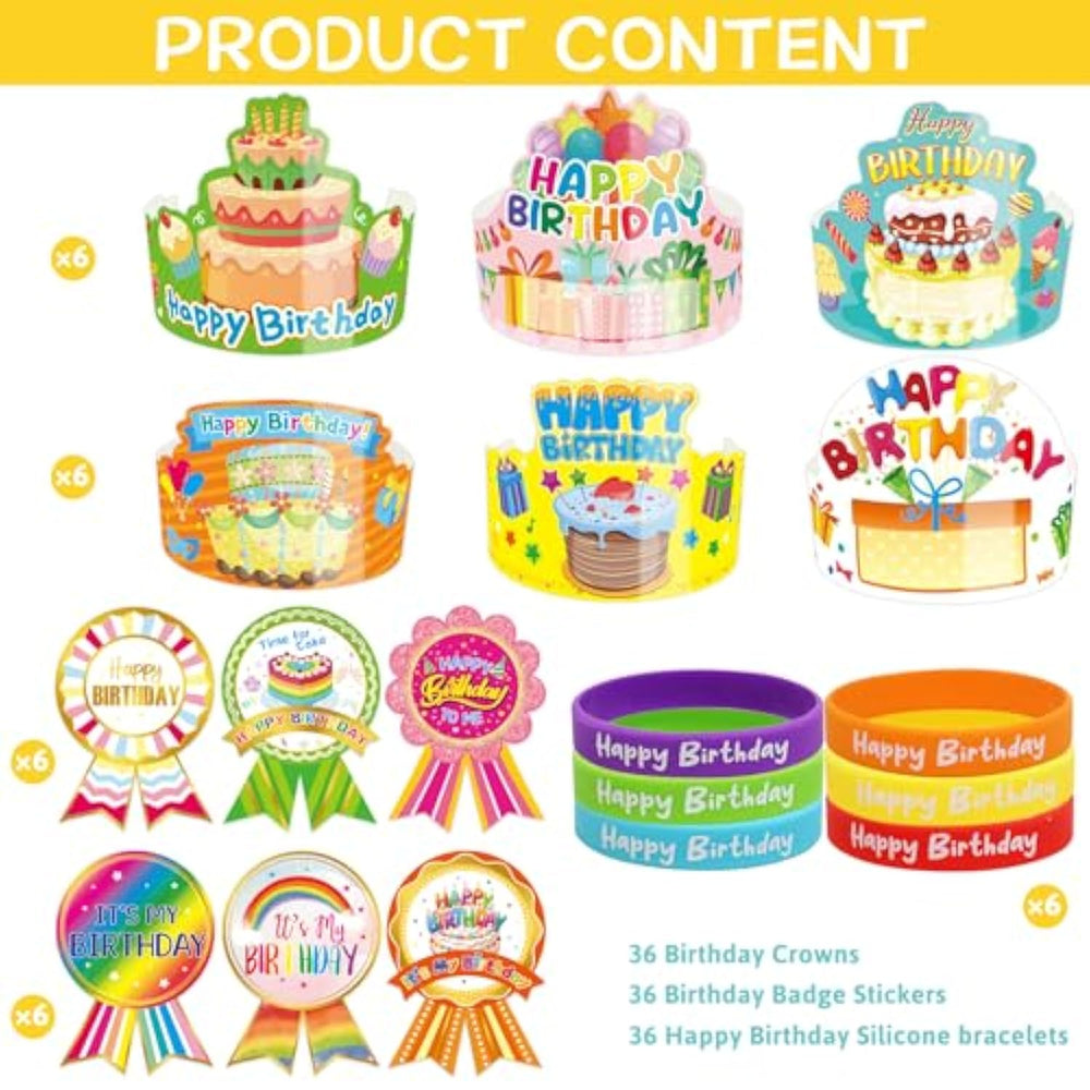 | What You Get: 36 Set Of Happy Birthday Kits For Kids. Include 36Pcs Happy Birthday Crowns, 36Pcs Colored Silicone Stretch Bracelets, 12 Sheet Birthday Badge Stickers | | Popular Design: 6 Cartoon Designs. Each Birthday Crown Size Is 14.6 X 5.2 Inches. Cardstock. Each Birthday Badge Stickers For Kids Is 3.8 X 2.6 Inches. It Contains A Lot Of Birthday Elements On The Hat, Like Balloon, Cupcake And So On | | Countless Uses: A Suitable Space On The Front Of The Birthday Hats To Write Name On. These Colored Bracelets Can Be Easily Worn On The Hand | | Colorful And Fun: These Badge Stickers Can Be Attached To The Chest Or Other Places You Want. A Perfect Party Favor To Make Sure All Your Guests Have A Set Of Birthday Kit To Help Celebrate The Birthday Star | | Our Advantages: 36 Birthday Kits In A Package, So You Can Always Have Some On Hand. Students Will Like Them | |