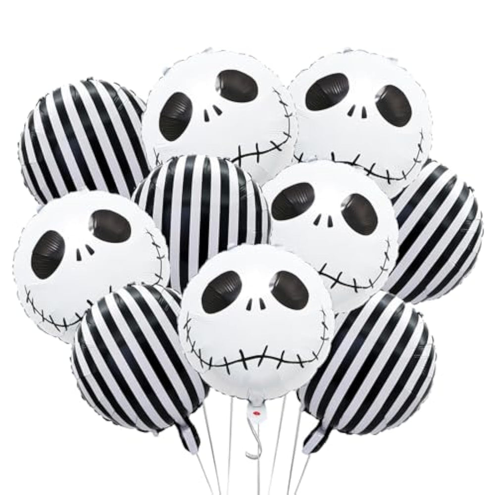 This Halloween balloon set includes 10 foil balloons—5 skull-shaped and 5 black-and-white striped, each 18 inches. Made from durable, reusable aluminum mylar, they can be filled with air or helium. The cute skull design and bold stripes add a festive touch, making them perfect for Halloween parties, masquerades, birthdays, graduations, baby showers, weddings, or spooky-themed events. Easy to use, the balloons feature a self-sealing valve for quick inflation and deflation. They can be displayed on ceilings, walls, doorways, or used as photo props to create a fun and memorable atmosphere.
