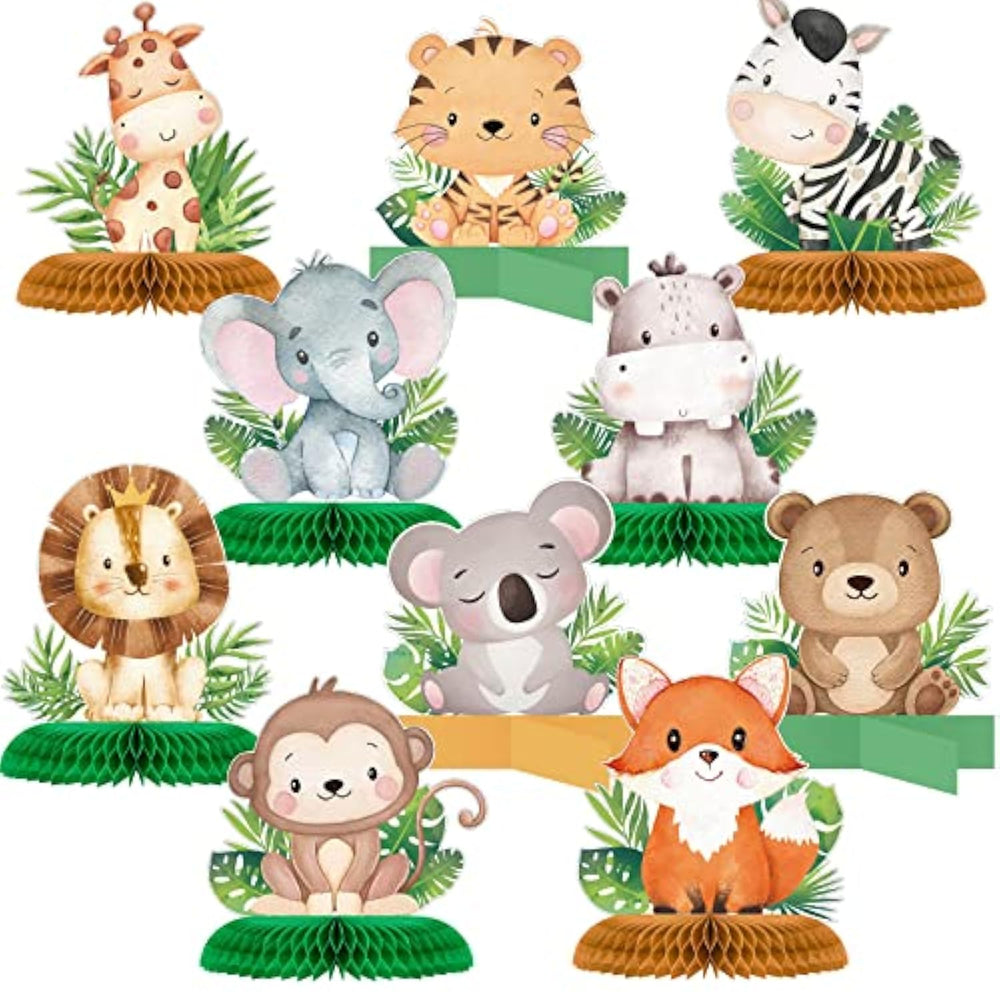 Add a lively touch to your party with these safari centerpieces for tables which include 10 pieces in total featuring 7 jungle honeycomb centerpieces and 3 standing cardboard decorations in various adorable designs. These jungle party centerpieces showcase cute safari animals like lions monkeys and elephants along with fresh leaf accents making them exquisite and eye catching. Made from reliable double sided printed cardboard and quality paper material for the honeycombs these decorations are stable durable and resistant to fading or tearing ensuring they will serve you beautifully for a long time.