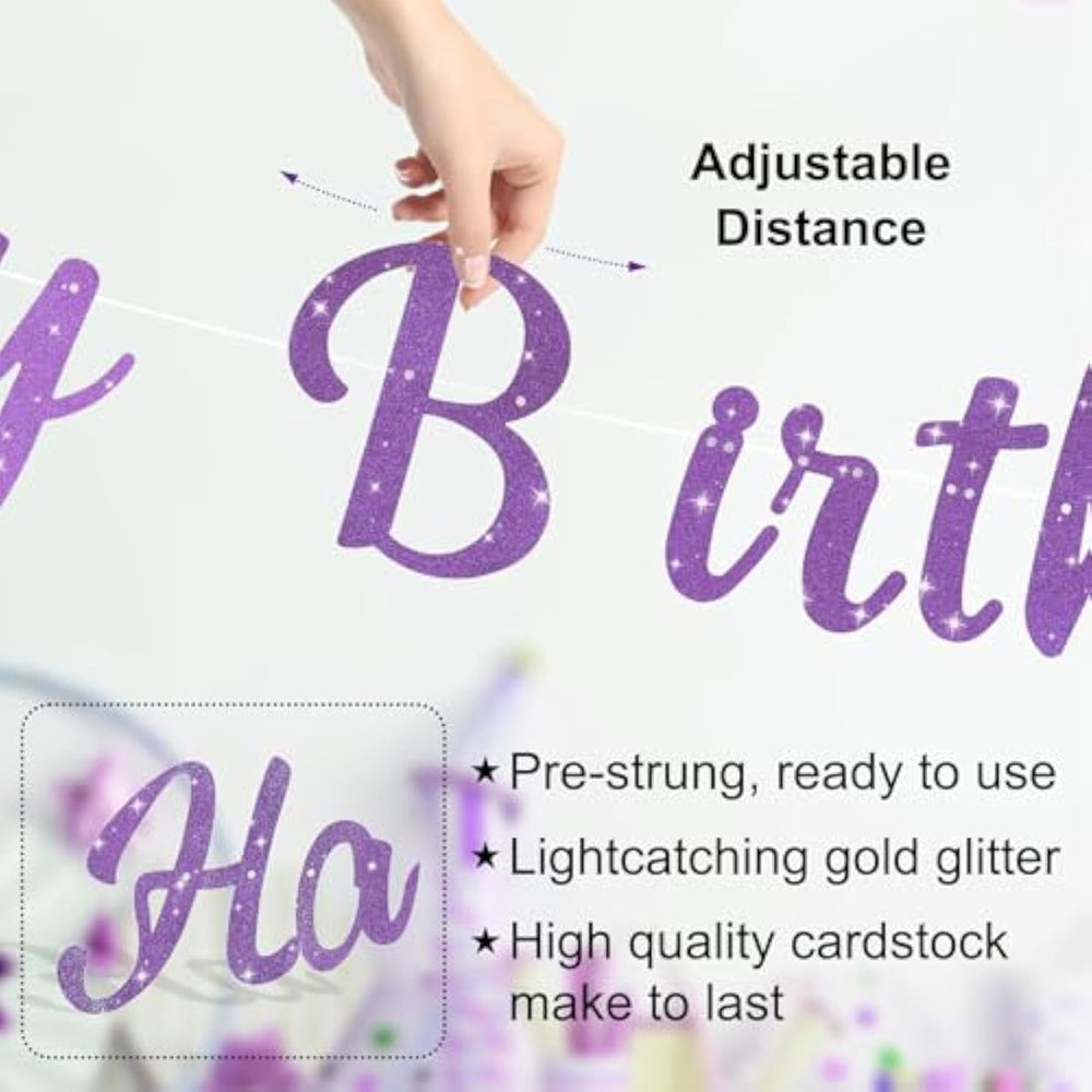 Create a magical and enchanting atmosphere with our stunning happy birthday banner, featuring glittering purple letters and a delightful combination of purple and pink decorations. Designed to make your celebration shine, this set includes a beautiful butterflies and circle dots garland that adds an elegant touch of glamour. The best part? No DIY required. The banner comes pre-strung with attached strings, making setup effortless—simply hang it on walls, windows, or across tables to instantly transform your space. The shimmering glitter details catch the light beautifully, whether indoors or outdoors, creating a dazzling effect that enhances the festive mood and ensures your birthday celebration is as vibrant and joyful as ever.