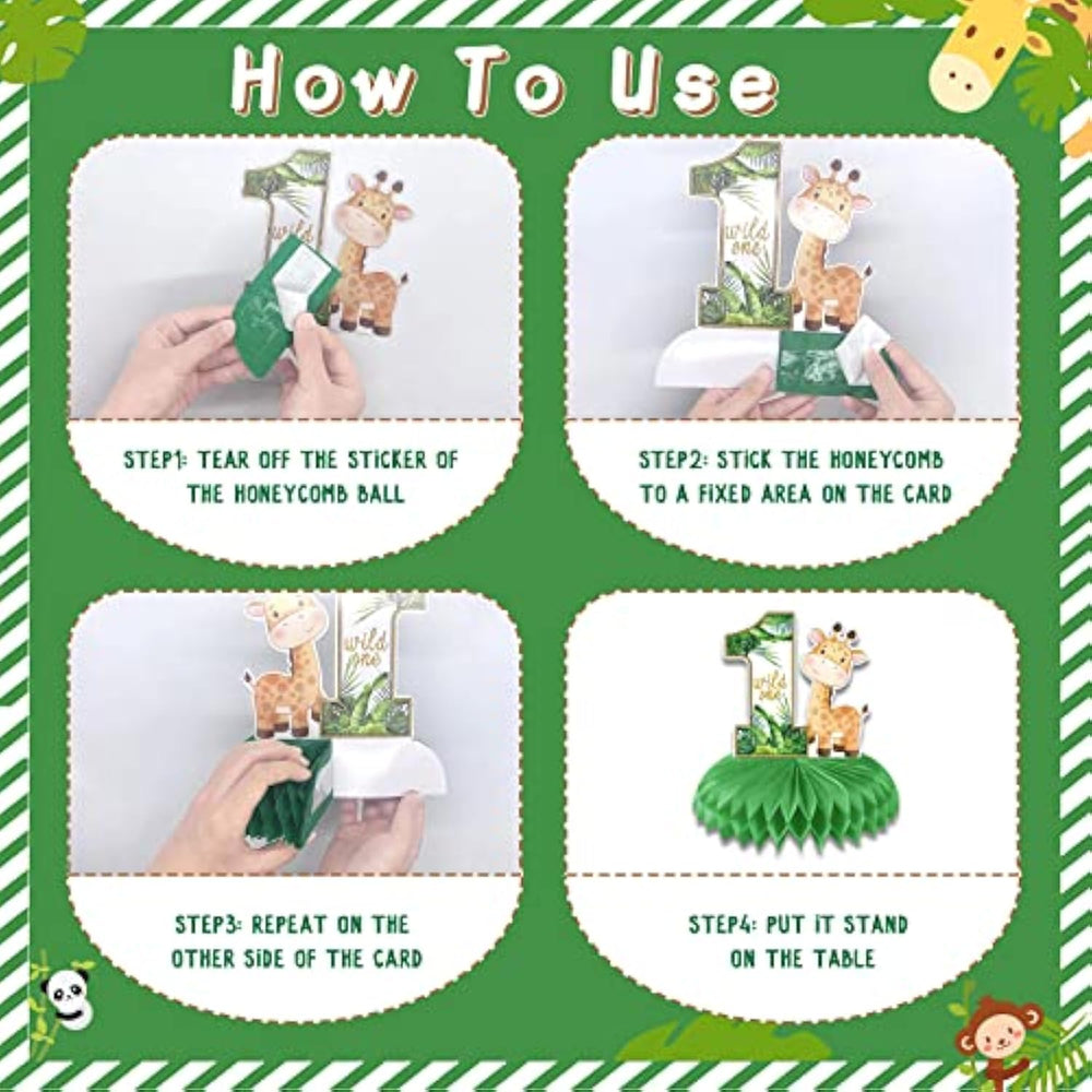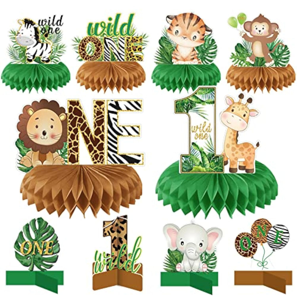 Add a fun and vibrant touch to your jungle-themed party with these wild one honeycomb centerpieces. Made from high-quality double-sided printed cardboard and sturdy paper honeycombs, these centerpieces are durable, stable, and resistant to fading, ensuring they can be reused for future events. The package includes 10 unique wild one designs, featuring adorable jungle animals, and 4 standing cardboard decorations, perfect for enhancing your jungle or safari-themed party. These decorations are easy to assemble—simply peel off the sticker from the honeycomb, attach it to the card, and repeat on the other side. The finished pieces are sure to make your party more attractive and enjoyable for all.