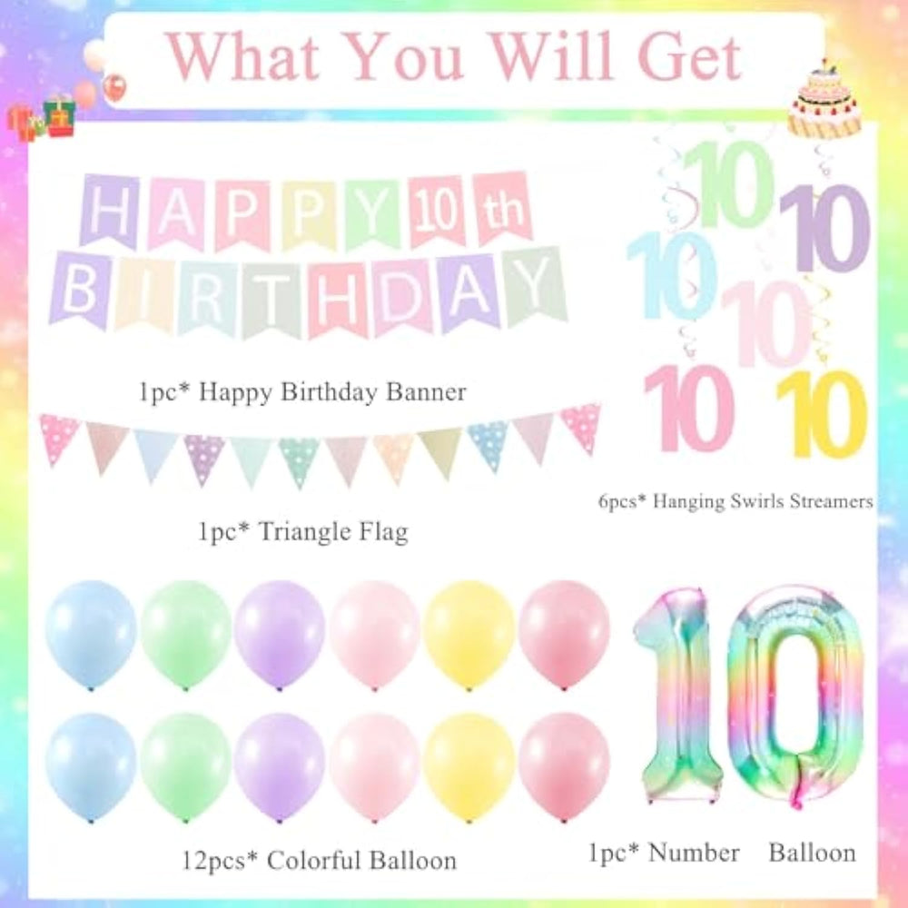| Package Included: Our 10Th Birthday Decorations Set Comes With 1Pc*Happy 10Th Birthday Banner, 1Pc*Triangle Banner, 6Pcs* Birthday Celebration Hanging Swirls Set, 1Pc*Rainbow Gradient Number 5 Balloon And 12Pcs*Balloons. The Whole Set Of Happy 10Th Birthday Party Decorations Is Very Easy To Use, You Can Easily Decorate A Whole Birthday Atmosphere Celebration Scene. The Combination Of Rainbow Colors Makes The Big Day Even More Dazzling And Impressive! | | Quickly To Use: Since The Banners And Spiral Decorations In Our 10Th Birthday Decorations Set Are Already Assembled, You Can Arrange The Birthday Scene Anytime And Anywhere Once You Get The Set, Which Is Very Time And Effort Saving | | Quality Material: Our Happy Birthday Banners And Triangle Banners Are Made Of Sturdy, High Quality Cardstock, And The Hanging Swirls Are Made Of Shiny Foil Material That Not Only Feels Textured, But Also Looks Great Hanging Anywhere | | Easily Match Any Scenes: Our 10Th Birthday Party Decorations Kits Are Portable And Easy To Use, So They Are Easy To Attach To Walls Or Hang On Objects, Whether Indoors Or Outdoors. With This Set Of Decorations You Can Feel Free To Use Your Creativity To Create An Unexpected Surprise | | Ideal Gifts: This Birthday Decoration Set Is Perfect For Him Or Her As A Gift To Surprise Your Siblings,, Relatives And Friends. Make Him Or Her The Life Of The Day, Shining In The Center Of The Party, And It Will Be A Most Memorable Day | |