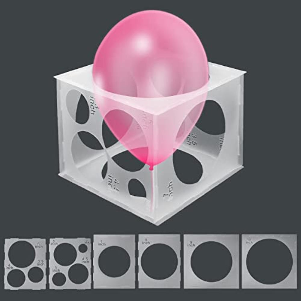 This balloon sizer cube box is a practical accessory for creating professional and uniform balloon decorations. Designed in a nearly transparent milky white color, it makes it easy to observe the balloon’s state while measuring. The box measures 12x12x12 inches and features 11 different hole sizes with clear markings ranging from 2 inches to 10 inches, ensuring accurate sizing for all your balloon decoration needs. Made from premium PP plastic, this sturdy and eco-friendly balloon measurement tool is lightweight, durable, and precisely cut using laser cutting technology, giving it smooth edges that won’t damage balloons. The detachable buckle design allows for easy assembly, disassembly, folding, and storage, making it highly portable and reusable. Perfect for building balloon arches, garlands, and columns, this balloon measuring cube is an essential tool for birthday parties, weddings, baby showers, and event decorations, helping you achieve a polished, professional look every time. 🎈