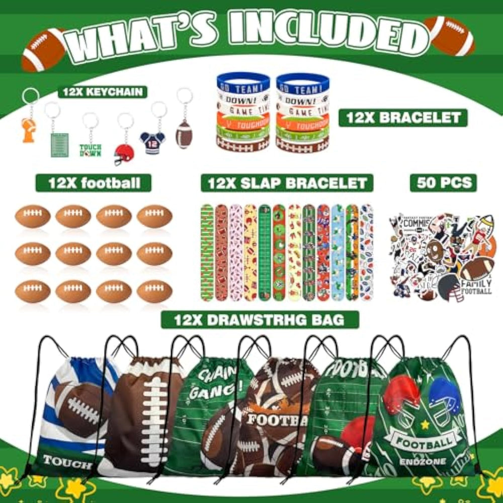 | What'S Included: This Set Includes Everything You Need For A Fun Football-Themed Event Or Party! You'Ll Receive 12 Football Drawstring Bags, 12 Mini Football Balls, 12 Football Party Keychains, 12 Wristbands In Various Designs, 12 Slap Bracelets, And 50 Football-Themed Stickers. That'S A Total Of 110 Pieces—A Complete Set With Plenty Of Items To Go Around! Perfect For Kids, Football Fans, Or Anyone Who Loves A Sporty Theme! | | Unique Design Drawstring Bags: This Set Includes 12 High-Quality Football Drawstring Bags With 6 Fun Designs, 2 Of Each Style. Great For Football-Themed Birthday Party Favors, These Bags Are Also Perfect For Everyday Use. These Bags Are Practical For School Supplies, Team Events, Or Giveaways. With 6 Unique Football Patterns, These Bags Are Sure To Impress Both At The Party And Beyond! | | Nice Workmanship: These Football Birthday Party Supplies Are Made With High-Quality Materials. The Football Drawstring Bag Is Crafted From Durable Oxford Cloth, Making It Lightweight, Foldable, And Strong. It’S Easy To Clean And Can Be Reused Multiple Times. The Colors And Designs Are Vibrant And Well-Coordinated, Ensuring The Items Look Great And Can Be Used For A Long Time. | | Fun And Interactive Party Experience: These Football-Themed Party Favors Are Not Only Great For Decorations But Also Provide Interactive Fun For Guests. The Mini Footballs, Slap Bracelets, And Football Stickers Can Be Used During The Party For Games, Challenges, Or Just To Keep Everyone Entertained. It’S A Perfect Way To Engage Kids And Make The Celebration Even More Exciting! | | Perfect For Any Event: These Football-Themed Party Supplies Are Great For Sports-Themed Parties, Football Fan Birthdays, Game Days, Outdoor Events, And More. The Football Party Favors Are Versatile And Can Be Used In Everyday Life. The Goodie Bags Make Excellent Gift Bags, Travel Pouches, Camping Backpacks, Or Toy Storage Bags. Plus, The Keychains Are A Fun Way To Decorate Your Keys Or Use As Small Keepsakes. | |