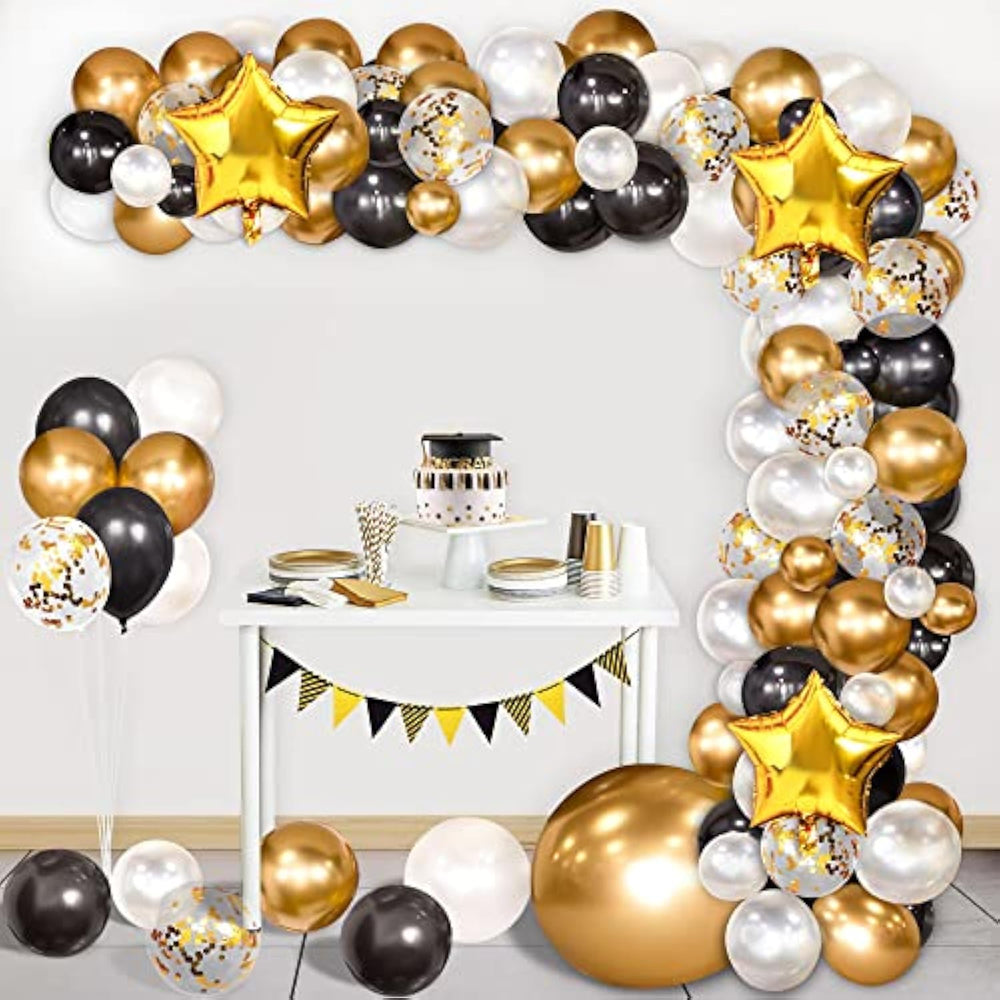 Graduation Party Decorations 2023 - A Balloon Arch Garland Kit Contains 31Pcs Black Balloons,32Pcs Metallic Gold Balloons,31Pcs White Balloons,10Pcs Confetti Balloons,3Pcs Star-Shaped Gold Foil Balloons,1Pcs Balloon Strip,1Pcs Dot Sticker Roll And 1Pcs Tying Tool.110Pcs In Total.It Must Be A Huge Photo Spot At Class Of 2023 Party! | Material Measurement - Most Of Balloons Are Made Of Latex Material,And The Star-Shaped Balloons Are Made Of Gold Foil.There Are Various Of Sizes Range From 5”To 18”. | Easy To Assemble Balloon Arch Kit - 1.Blow Up The Balloons By Hand Pump Or Balloon Compressor (Not Included).2.Tie Them With The Tying Tool.3.Insert All Balloons Into The Balloon Strip On By One.4.Hang The Balloon Garland Up To Wall,Home,Party,Etc.5.Stick The Star-Shaped Gold Foil Balloons Anywhere You Want.?Instruction Is Included.? | Suitable For Many Occasions - The 2023 Graduation Party Decorations Balloon Arch Garland Kit Can Be Used To Decorate Any Themed Graduation Party,Photo Background,Graduation Decoration Class Of 2023,Weeding Anniversary,Birthday Party Decoration,Etc.It Will Add More Atmosphere For Your Party! | Note - No Air Pump No Banner No "Congratulations?"Please Do Not Fill The Balloons With Too Much Air In Case It Bursts.Kids Should Use It Under Adult Supervision.It Might Have Smell When You Open The Package.Just Air It Out For 1-2 Days.The Smell Would Go Away. |