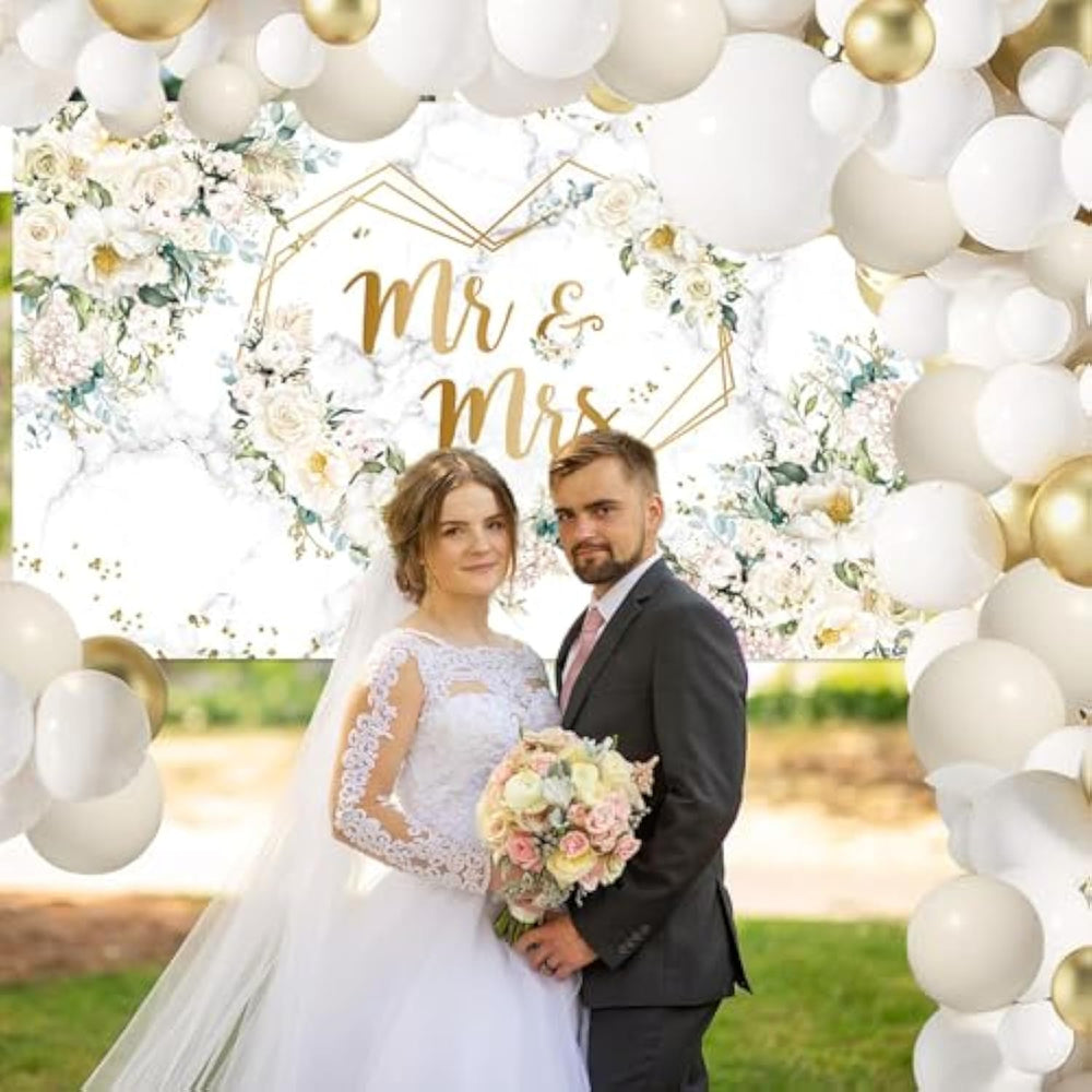 | Mr Mrs Bridal Shower Decorations Set: 1.1X1.8 M Mr Mrs Backdrop(Each Corner Has One Hole); White, Gold And Sand White Latex Balloons; Dispensing Glue; White Color Ribbon; Knotter; You Can Use These Creat A Beautiful Scene For Your Baby Shower, Birthday Party | | Wedding Party Supplies Material: Our Mr And Mrs Wedding Banner Is Made Of Economical Flag Banner.It'S Seamless, Lightweight, Non-Fading And Easy To Carry.White, Gold And Sand White Balloons Are Made Of Latex Balloons | | Creat Wedding Party Balloons Arch: We Have Selected White, Gold And Sand White Balloons For Your Wedding Bridal Shower Party, A Variety Of Different Colors And Materials To Match With Each Other, Suitable For Bridal Shower Party Decorations For Bachelorette, Engagement And Couple Wedding Party Decor | | Easy To Install Diy Yourself: We Provide Strings,So You Can Easily Match With Banners. Balloons Are Easy To Inflate And Assemble, You Can Use These Beautiful Balloons To Design Your Own Party, Such As Making An Arch, Decorating Any Place You Like, Adding Joy And Creativity | | Warning: Choking Hazard -- Children Under 8 Years. Can Choke Or Suffocate On Uninflated Or Broken Balloons. Adult Supervision Required. Keep Uninflated Balloons From Children. Discard Broken Balloons At Once | |