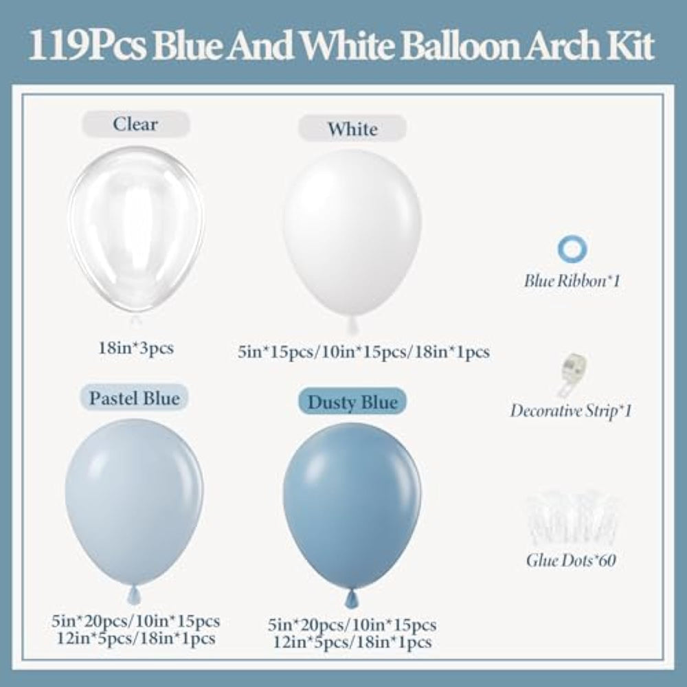 The dusty blue balloon arch kit includes 41 dusty blue balloons in various sizes, 41 light blue balloons, 31 white balloons, three clear balloons, 60 glue dots, a blue ribbon, and a decorative strip. Made from high-quality latex, these balloons are durable and easy to inflate with a pump. The kit comes with essential accessories for effortless assembly—inflate the balloons, form clusters, insert them into the decorative strip, and secure them with ribbon or glue dots. Perfect for baby showers, weddings, gender reveals, bridal showers, and birthdays, this balloon garland adds a stylish touch to any celebration.