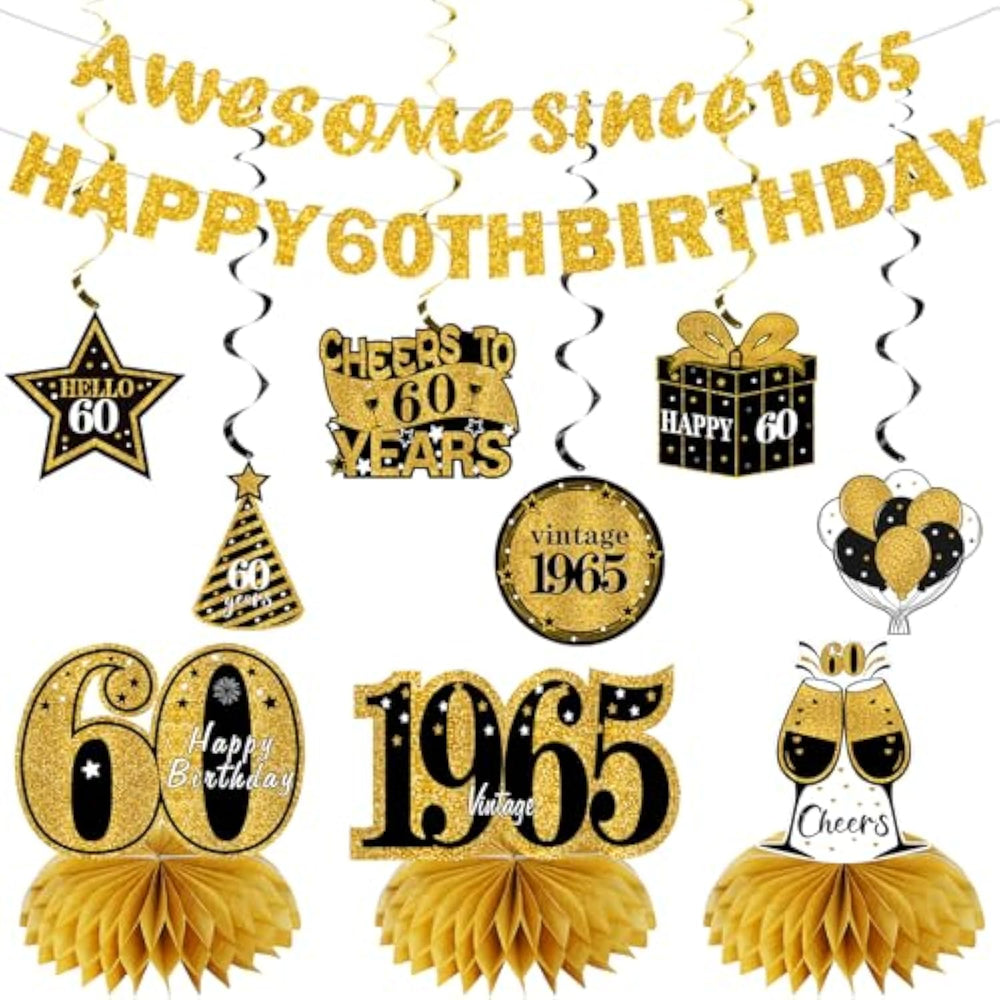 | 100%Paper | | [You Will Get] - Black Gold 60Th Birthday Decoration Kit, Including 1Pcs "Happy 60 Th Birthday" Banner,1Pcs"Awesome Since 1965", 6Pcs 60Th Birthday Hanging Swirls, 3Pcs 60 Birthday Table Honeycombs Centerpieces. They Are Enough To Decorate Your 60Th Birthday Party. | | ?[Unique Design] - This Set Features A Unique And Fun Retro Design In Black And Gold, Adding Various 60Th Birthday Party Elements Such As Stars And Balloons. Banner, Honeycomb, And Sea Gold Vortex Decoration Types Create A Perfect 60Th Birthday Party For You. | | [Applicable Scenario] - Suitable For Your 60Th Birthday Party. The 60Th Birthday Banner And Honeycomb Can Be Hung On The Dessert Table, And The 60 Year Old Birthday Swils Can Be Used As Ceiling Decoration, Yard Decoration. It Can Meet Your Various Decoration Needs, And Also Serve As A Background For Taking Photos. ? | | [Easy To Install] -The Banners And Swirls Have Pre-Cut Holes So You Can Simply Unfold Them And String Them Together For Easy Decoration. | | [High Quality Material] -Made Of High Quality Card And Metal Foil, Durable?Lightweight And Portable, Reusable. | |