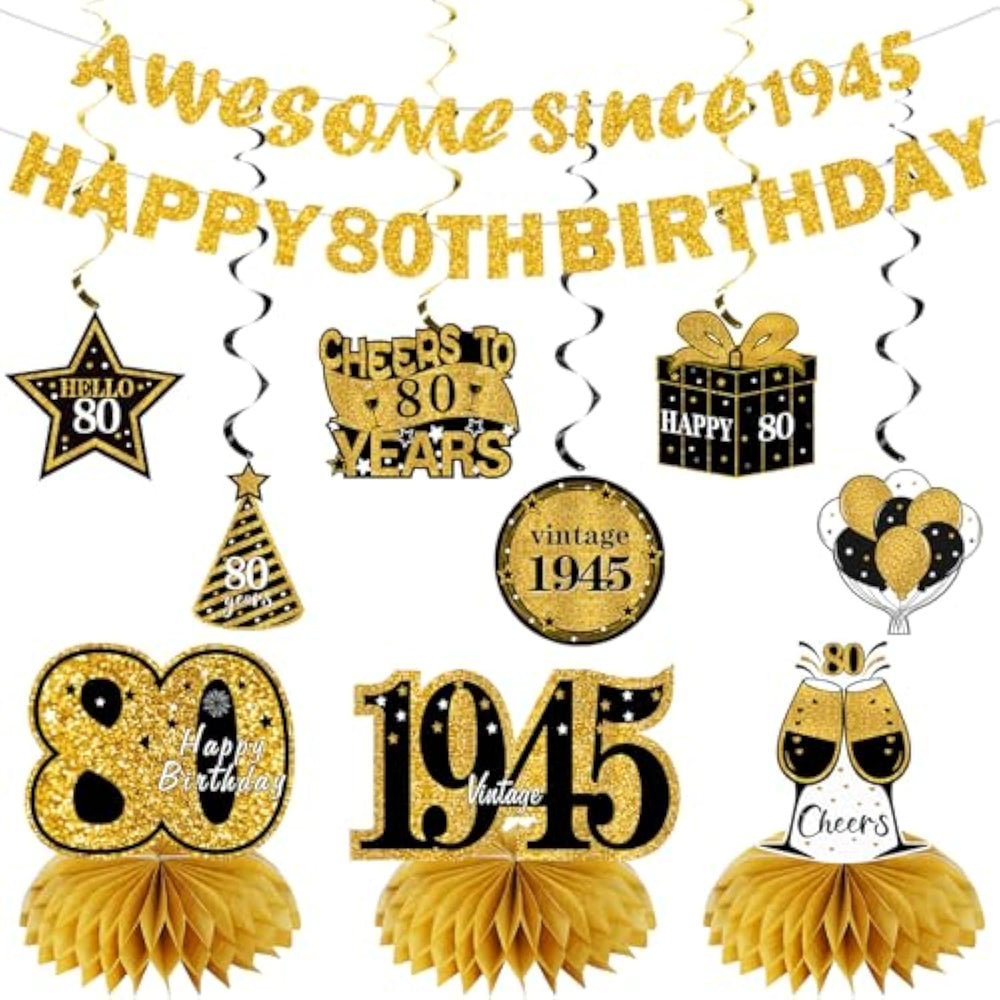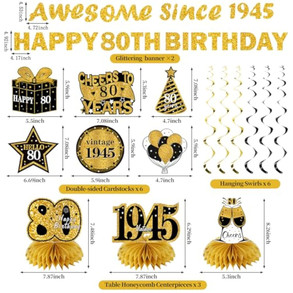 | 100%Paper | | [You Will Get] - Black Gold 80Th Birthday Decoration Kit, Including 1Pcs "Happy 80 Th Birthday" Banner,1Pcs"Awesome Since 1945", 6Pcs 80Th Birthday Hanging Swirls, 3Pcs 80 Birthday Table Honeycombs Centerpieces. They Are Enough To Decorate Your 80Th Birthday Party. | | [Unique Design] - This Set Features A Unique And Fun Retro Design In Black And Gold, Adding Various 80Th Birthday Party Elements Such As Stars And Balloons. Banner, Honeycomb, And Sea Gold Vortex Decoration Types Create A Perfect 80Th Birthday Party For You. | | [Applicable Scenario] - Suitable For Your 80Th Birthday Party. The 80Th Birthday Banner And Honeycomb Can Be Hung On The Dessert Table, And The 80 Year Old Birthday Swils Can Be Used As Ceiling Decoration, Yard Decoration. It Can Meet Your Various Decoration Needs, And Also Serve As A Background For Taking Photos. | | [Easy To Install] -The Banners And Swirls Have Pre-Cut Holes So You Can Simply Unfold Them And String Them Together For Easy Decoration. | | [High Quality Material] -Made Of High Quality Card And Metal Foil, Durable?Lightweight And Portable, Reusable. | |