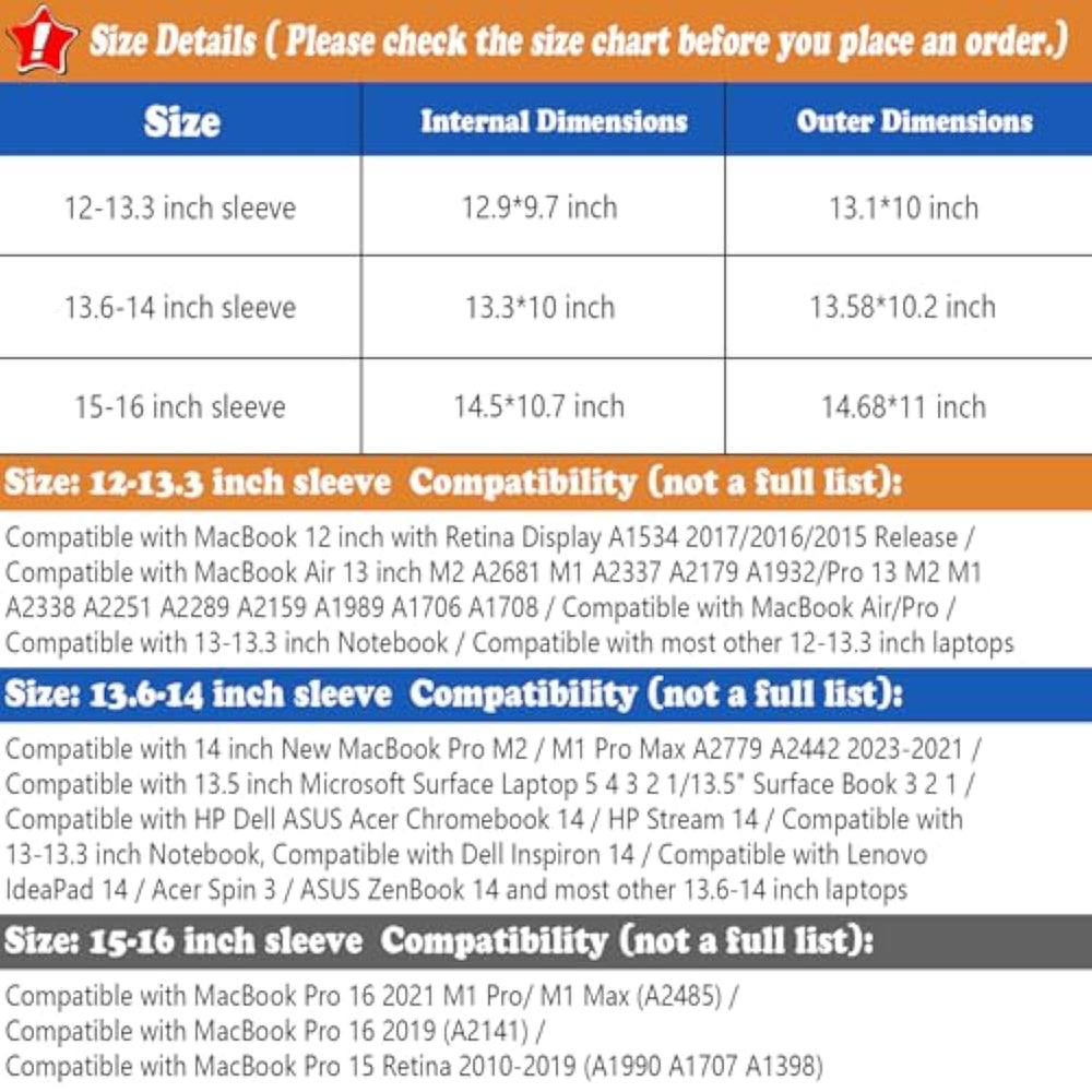 | Dimension: Sleeve Size: External Dimensions: (L X W ) 33.5 X 25.5 Cm / (L X W ) 13.1 X 10 Inch. Internal Dimensions: (L X W ) 33 X 24.7 Cm / (L X W ) 12.9 X 9.7 Inch. Please Measure Your Laptop Before Purchg. (The Sum Of The Width (Length) And Thickness Of Your Laptop Should Be Less Than The Internal Width (Length) Of The Sleeve.) Small Bag Size:(L X W X H) 16 X 11.5 X 5.5 Cm / (L X W X H) 6.3 X 4.5 X2.1 Inch | | Compatible Models: Compatible With Macbook 12 Inch With Retina Display A1534 2017/2016/2015 Release, Compatible With Macbook Air 13 Inch M2 A2681 M1 A2337 A2179 A1932/Pro 13 M2 M1 A2338 A2251 A2289 A2159 A1989 A1706 A1708, Compatible With Macbook Air/Pro, 13-13.3 Inch Notebook, And Most Other 12-13.3 Inch Laptops | | Premium Material: Our Laptop Sleeve And Small Bag Are Made Of Outstanding Pu Leather, The Outer Layer Is Water-Resistant And Dust-Proof, And The Inner Layer Is Soft To Touch, It Can Effectively Protect Your Laptop From Unnecessary Scratches Or Stains, Durable For Long Time Use. The Weave Handle Strap Is Handmade By Our Proffessional Worker, It Is Durable And Unique | | Portable Design: Slim And Light-Weight Design Which Is Easy To Carry By Hand Or Slide Into Handbag/Shoulder Bag. Suitable Laptop Sleeve For Your Daily Use In Office, Coffee Bar And Home. Tje Small Bag Can Store Your Small Accessories Like Cell Phone, Keys, Bank Power, Data Cable, Earplugs, Laptop Mouse And So On | | Multifunctional: The Laptop Sleeve Could Not Only Store Your Laptop But Also Be Used As A Mouse Pad After It Has Been Unrolled Which Allows You To Work Easily In Different Places | |