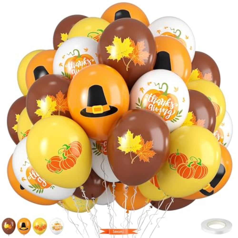 This festive set includes 30 twelve-inch fall-themed balloons: brown maple leaf, orange with hat print, deep yellow with pumpkin print, and white with pumpkin print, plus a 10-meter white ribbon for easy decorating. Suitable for air or helium inflation, the balloons can float above tables, be tied to chairs, or incorporated into a balloon arch to enhance Thanksgiving, autumn birthdays, pumpkin-themed events, or fall baby showers. Their vibrant prints and warm hues bring seasonal charm to any gathering, creating festive backdrops, balloon bouquets, or centerpiece accents, adding a cheerful autumn touch to celebrations.
