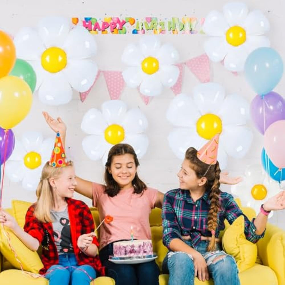This daisy balloon set includes 12 balloons in varying sizes: 2 large (43-inch), 5 medium (28-inch), and 5 small (20-inch), along with a roll of yellow ribbon, a roll of white ribbon, and a 3.1-inch straw for easy inflation. Crafted from high-quality aluminum foil, these balloons are lightweight, durable, safe, and reusable, featuring vivid printed colors and realistic daisy patterns that won’t easily crack or fade. Perfect for daisy-themed parties, birthdays, baby showers, weddings, or flower-themed celebrations, these charming balloons can be used alone or combined with other balloons to create eye-catching balloon arches and festive decorations. Inflation is simple—just use the included straw or a pump, pinch the expansion port to seal, and enjoy a beautiful, hassle-free party display.