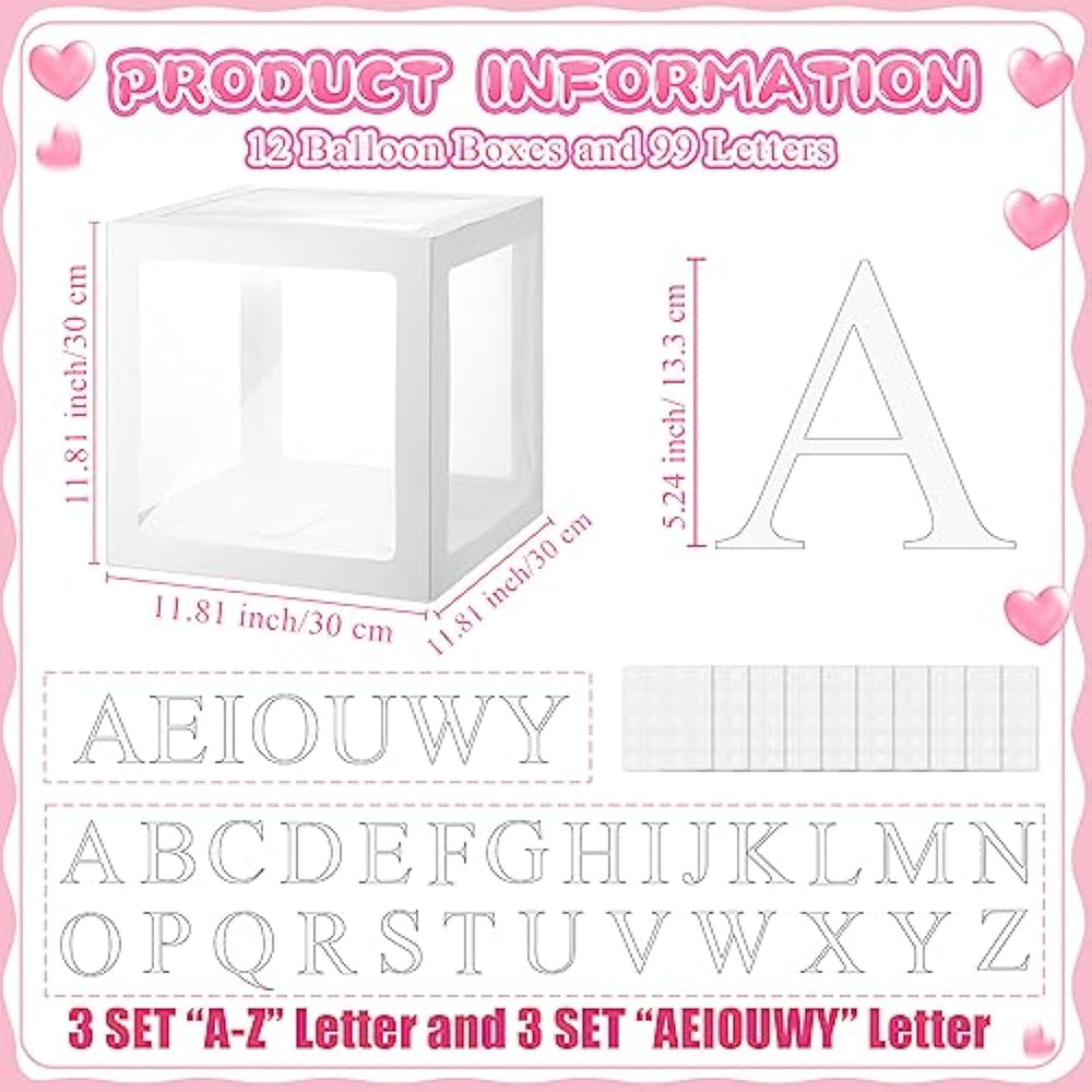 | Nice And Elaborate Combination: There Are 12 Pieces Clear Baby Shower Balloon Boxes And 99 Pieces Cardboard Letters Including 3 Sets Cardboard Letters Of "A-Z" And 3 Sets Cardboard Letters Of "Aeiouwy", And You Can Randomly Choose Letters To Paste On The Balloon Boxes | | Provide Trustworthy Quality: The White Clear Balloon Box Blocks Are Made Of Quality 350G Hard Cardboard And Pvc Materials, And The Letter Stickers Are Made Of Quality White Cardboard; It Should Be Noted That The Cardboard Edges Of The Balloon Box Need To Be Folded Toward The Inside Of The Box First And Then Closed, So That The Box Will Be Stronger, Otherwise The Box Will Be Easily Damaged Or Collapsed | | Proper Size To Apply: The Balloon Boxes With Letters Measure Approx. 11.81 X 11.81 X 11.81 Inches/ 30 X 30 X 30 Cm, Proper Size To Match With Other Party Decoration Supplies, Ideal For Displaying In Your Party As Crafts | | Easy To Assemble: The Baby Boxes With Letters For Baby Shower Are Easy To Assemble And Fold, And You Can Add Some Balloons Or Flowers In The Box To Make Your Party Decoration Charming And Vibrant; When Your Party Is Over, Just Fold The Box Back And Use It Again | | Practical And Utility Party Decorations: These Clear Balloon Boxes And Balloon Letters Are Ideal For Baby Showers, Gender Reveal Parties, Bridal Showers, Engagement Parties, Bachelorette Parties And So Forth | |
