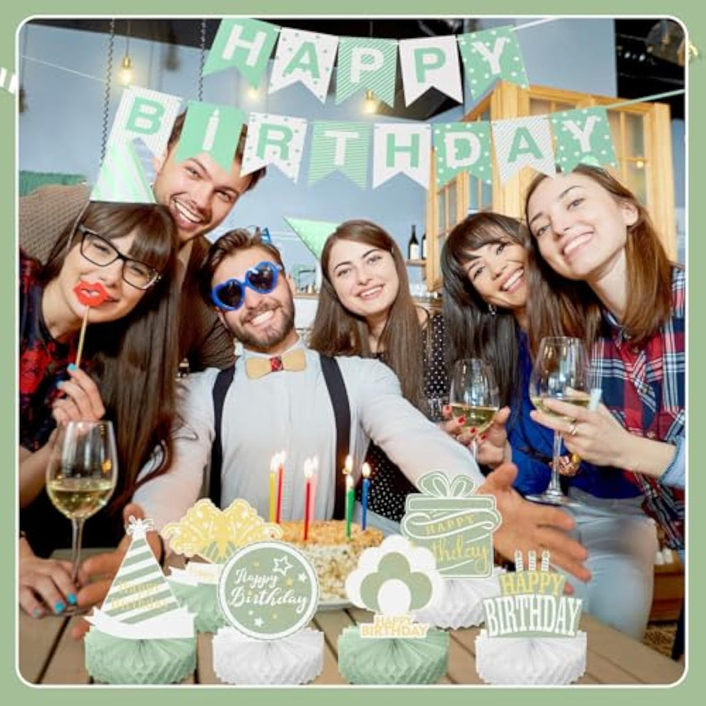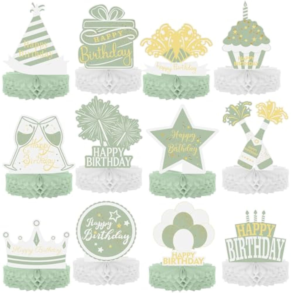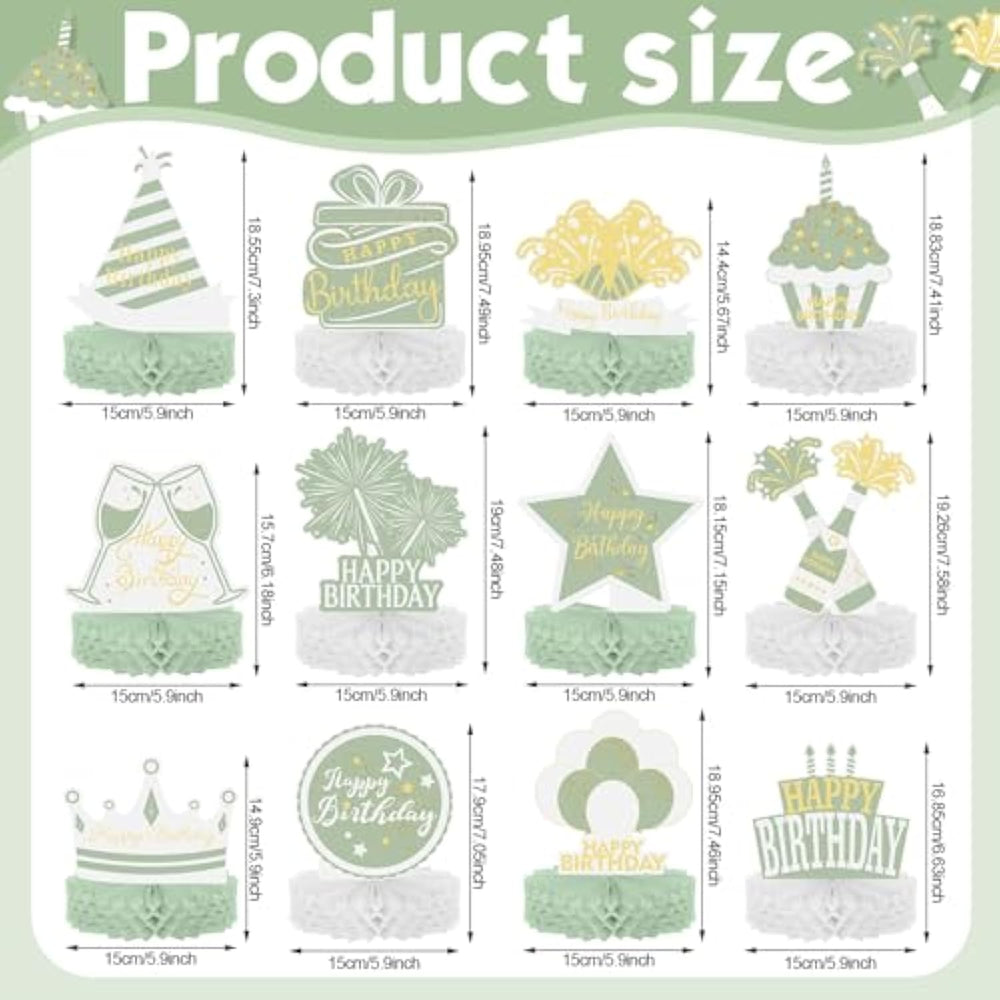 These colorful birthday table decorations in gold and sage green are designed to create a cheerful and festive atmosphere for your themed party. The set includes 12 pieces of sage green and gold honeycomb centerpieces featuring Happy Birthday, candles, balloons, gift boxes, hats, cakes, and more, adding a pleasant and vibrant touch to your celebration. Each centerpiece is easy to assemble with clearly marked areas for quick setup, saving you time and allowing you to enjoy the party more. Made from thick, reliable cardstock with double-sided printing, these decorations are lightweight, durable, and colorfast, making them perfect for your party supplies and decorations.