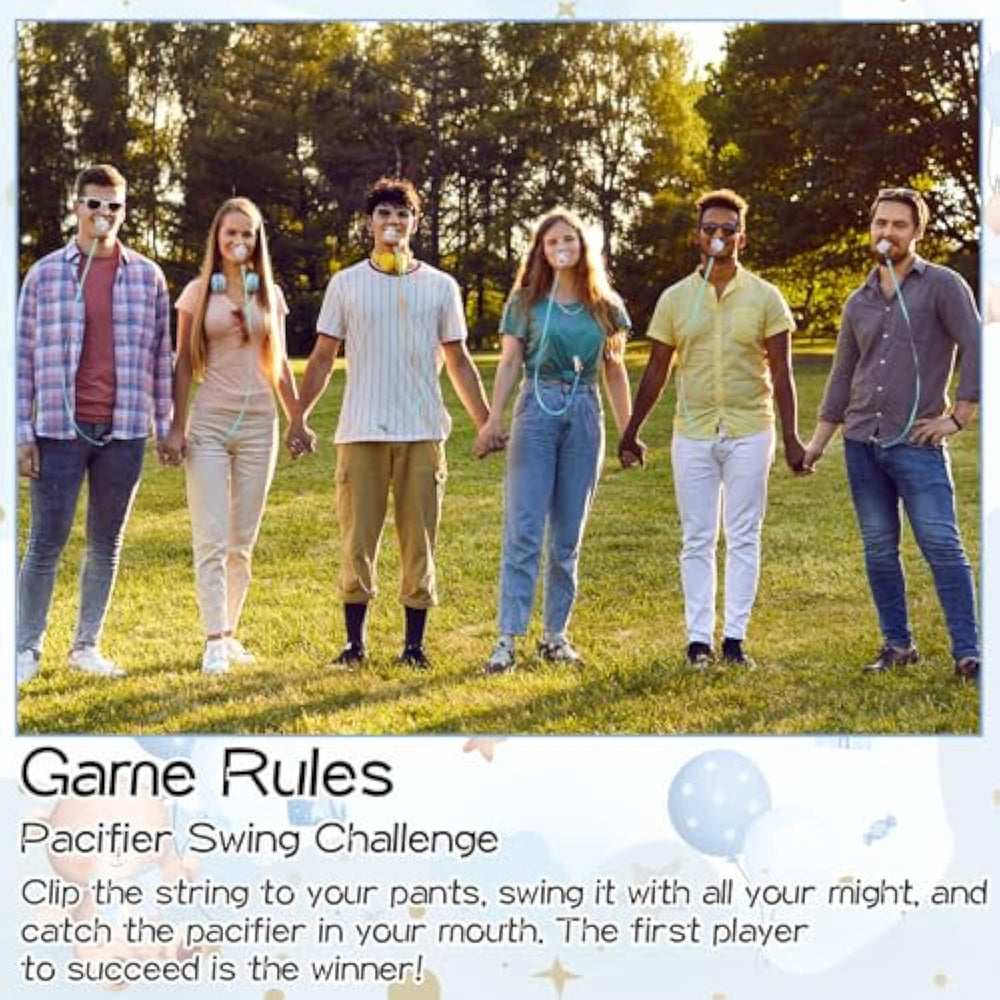 | Nice Combination For Fun: This Package Includes 1 Wooden Bear Sign And 12 Sets Of Swing Pacifiers; With Enough Quantity To Cover Your Needs Or To Share With Friends And Family, It'S An Ideal Choice For Creating Memorable Moments | | Pacifier Swing Game: Add A Twist To Your Baby Shower Games With The Exciting Pacifier Swing Challenge; Clip The String To Your Pants, Swing With All Your Might, And Try To Catch The Pacifier With Your Mouth; The First To Succeed Wins, Though It'S All About The Laughs, Fun, And Friendly Competition | | Pacifier Swing Race: Get Ready For Action; It'S Not Just About The Game; It'S A Race; Test Your Timing, Coordination, And Swing Skills As You Compete With Friends To Catch The Pacifier; The Race Is Thrilling, But The Laughter Never Stops | | Simple And Entertaining: We'Ve Created The Ideal Set For Endless Fun; With Sturdy Materials And An Easy To Clip Setup, You'Ll Enjoy Playing Again And Again; Whether You'Re A Novice Or A Professional, This Game Ensures Lots Of Laughs And Good Times | | Ideal For Any Event: From Baby Showers To Bridal Showers To Birthdays, This Game Is Suitable For Any Party; It'S A Fun, Interactive Game Gift Set That Will Get Everyone Laughing And Connecting Quickly | |