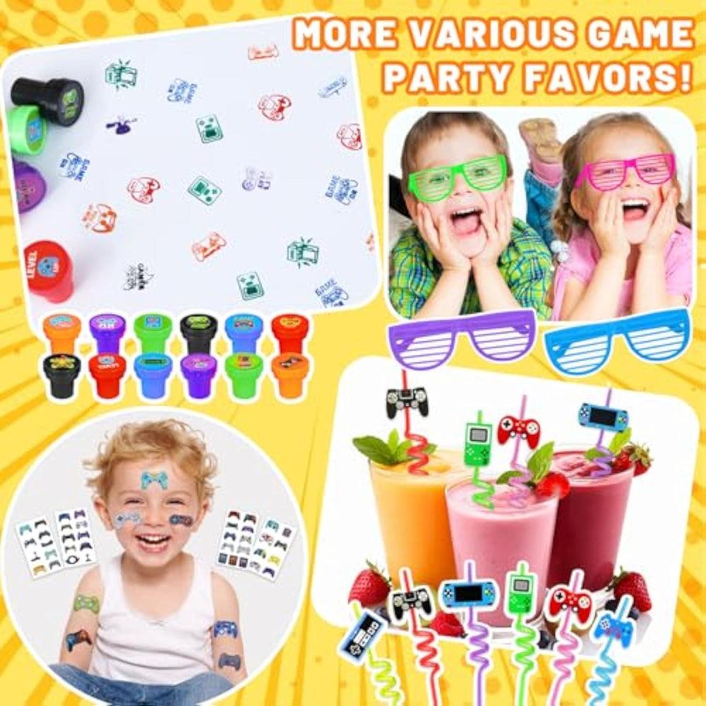 | 120 Pcs Luxury Video Game Party Favors: Level Up Your Celebration With With Our Gaming Party Favors! Game On Party Favors Includes 12 Glasses, 12 Gift Paper Bags With Closure Stickers, 12 Unique Invisible Ink Pens, 12 Mini Notebooks, 12 Slap Bracelets, 12 Controller Keychains, 12 Straws, 12 Stamps, 12 Silicone Bracelets, And 12 Tattoo Stickers For Video Game Birthday Party Decorations. | | High Quality Non-Toxic: Your Child'S Safety Is Our Top Priority. All Our Video Game Birthday Party Favors Are Crafted From Premium, Non-Toxic, And Sturdy Materials Designed To Withstand Hours Of Fun. The Sturdy, Reusable Gamer Party Favor Bags Feature Awesome Gaming Graphics And Are Perfect For Holding All The Included Prizes Plus Extra Gifts. | | Immersive Game Party Favors Experience: Gamer Party Favors Are Designed For Maximum Interaction And Fun. The Vibrant Glasses Are Perfect Photo Props For Hilarious Memories, While The Temporary Tattoos Make Your Party Full Of Game Theme Color, More Fun And Popular. Ultimate Gamer Party Favors For Boys Creating An Engaging Atmosphere, Has Been Well Received By Game Enthusiasts. | | Versatile For Any Gaming Event: The Invisible Ink Pens And Notebooks In Video Game Party Favors Are A Unique And Perfect Match. Every Accessory Is Full Of Gaming Elements, Gaming Party Favors Perfect Suitable For Birthday Party And Gamer Theme Parties, Pinatas, Carnivals, Reward Boxes, Classroom Treasure Box Prizes, Thanks Giving, Game On Party Give Away Items And Christmas Gifts For Boys Girls. | | Quality After-Sales Service: We Have Been Committed To Bringing