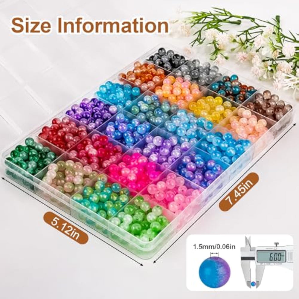 This set includes 24 types of dual-color glass beads featuring glass pearls, imitation jade glass, cracked frosted beads, imitation opal, and AB-colored plated styles, offering a wide variety of perfect craft beads ideal for jewelry making and DIY projects such as Halloween, Christmas, Mother's Day, and birthday gifts With approximately 50 beads of each color totaling around 1200 beads, this collection provides an abundance of options to help you create unique crafts that showcase your personal style The beads are about 6mm in diameter with apertures ranging from 1.1 to 1.5mm, making them great for creating beautiful bracelets and necklaces with loved ones during holidays or special occasions These beads also make thoughtful DIY craft gifts for Mother's Day, Father's Day, Teacher's Day, Valentine's Day, or Christmas.