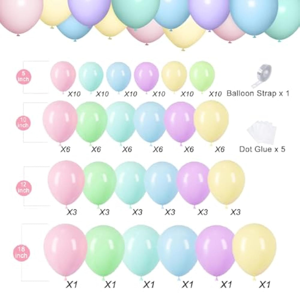 The Pastel Balloons Pack includes 120 balloons in a variety of vibrant pastel colors, such as yellow, pink, blue, green, teal, and purple. These thick macaron balloons are made from 100% natural latex, making them safe, odor-free, durable, and long-lasting. Perfect for creating a rainbow balloon theme or any other party theme, these balloons are ideal for birthdays, rainbow parties, unicorn-themed events, baby showers, bridal showers, and more. The included balloon decorating strip allows for easy assembly of balloon arches and garlands, while the balloon dot glue helps fill in gaps with smaller balloons for a polished look. This kit is perfect for creating gorgeous, vibrant decorations for your next celebration.