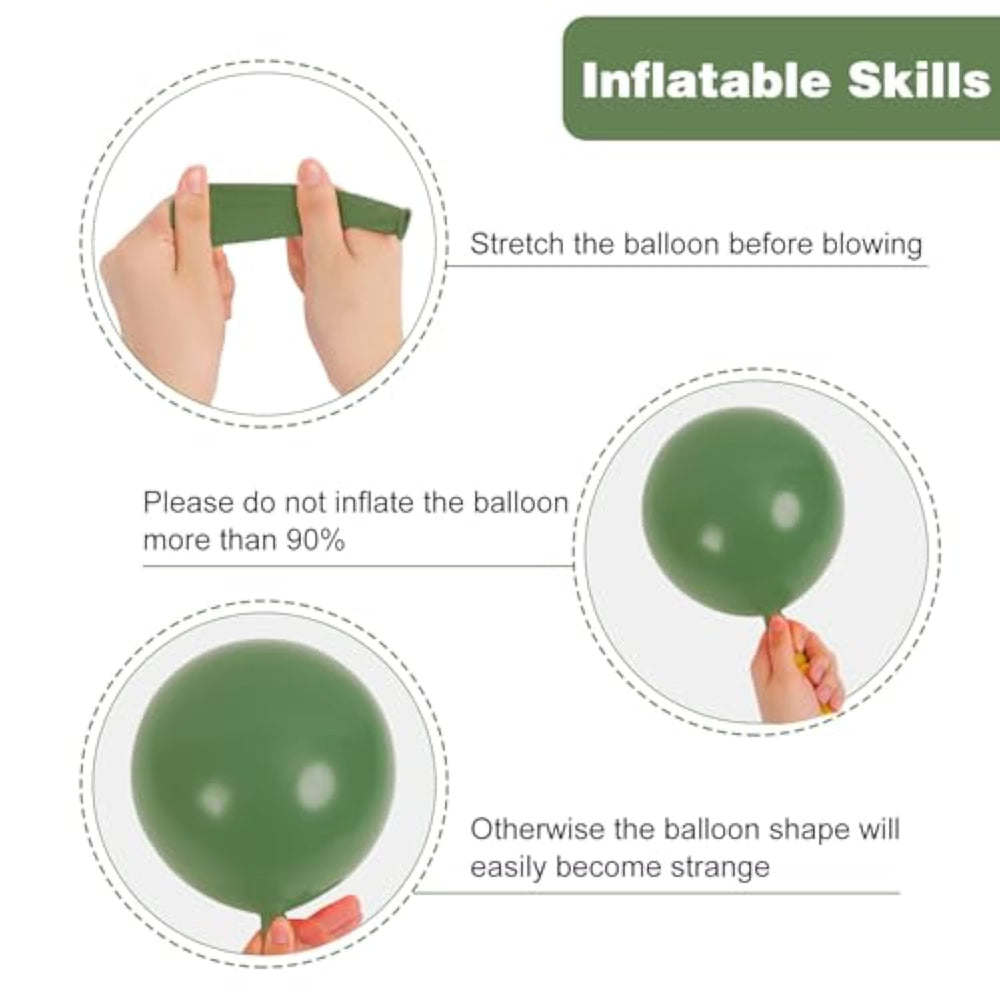 | [All-In-One Kit] This Balloon Kit Includes Everything You Need To Create A Stunning Decoration, 50 Sage Green Balloons, 35 Sand White Balloons, 15 Gold Confetti Balloons, 20 Gold Balloons And 2 Rolls Of Green And Gold Ribbons. The Size Of The Balloon Is About 12 Inches After Inflation. The Synergy Of Green And Gold Can Make Any Party Or Occasion More Elegant. | | [Safe Substance] Our Balloons Are Made Of Top Quality And Atoxic Latex. You Can Use It Safely At Parties. Overfilling The Balloons May Cause The Balloon To Burst. Please Pay Attention To And Avoid High Temperatures, Sharp Objects And Friction. | | [Any Happy Moment] Our Latex Balloon Sets Can Add Atmosphere To Your Party. It Is The Perfect Decoration For Happy Occasions Or Celebratory Moments Such As Eucalyptus Themed Parties, Bridal Showers, Weddings, Baby Showers, Engagements, Graduations, Birthday Parties, Suitable For Both Indoor And Outdoor Events. | |