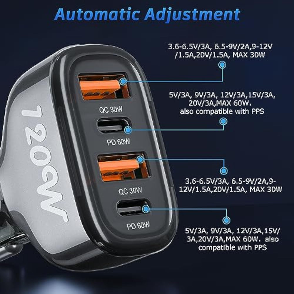 | 4-Port Fast Car Charger: 120W Multi-Port Charger Adapter Has Unparalleled Charging Speed (Usb Car Charger Socket 12V/24V) And 4 Ports (2 Usb-C Ports, 2 Usb-A Ports). Charge Multiple Devices Simultaneously At Maximum Speed. Charges Iphone 14 From 0-80% In 30 Minutes. Charges Most Android Devices From 0% To 70% In 35 Minutes. Pd Can Reach 60W Max Output, Qc Can Reach 30W Max Output. It Supports Pps/Pd3.0/Qc3.0/Afc And Fcp Super Fast Charging Protocols | | Power 4 Devices Simultaneously: Multi-Port Usb-C Car Charger Allows You To Charge Up To 4 Devices Simultaneously With A Total Output Of 120W. It'S The Perfect Solution For Families On The Go, Especially When Traveling With Kids In The Backseat. No More Bickering Over Who Gets To Charge Their Devices First! Make Traveling Easier And Keep Everyone Powered Up With This Thoughtful Gift | | Compact Design: The Car Charger Adapter Adopts High-Grade Gray + Transparent Fashion Design, Small And Compact Design Increases Portability, Its Cigarette Butt Is Seamlessly Integrated With The Car’S Cigarette Lighter, Ensuring A Secure Connection. The Car Charger’S Cigarette Butt Buckle Prevents Accidental Popping Open. Equipped With A Blue Light, It’S Easy To Locate The Car Charger Even In The Dark. With Excellent Charging Speed, Making It A Perfect Choice For Daily Car Travel | | Ul Certification: Made Of Pc Flame Retardant Material Combined With Abs. Car Cigarette Lighter Fast Charger Has Built-In Multiple Protection Measures To Prevent Short Circuit, Overheating, Overcurrent And Overcharging. The Usb Car Charger Can Automati
