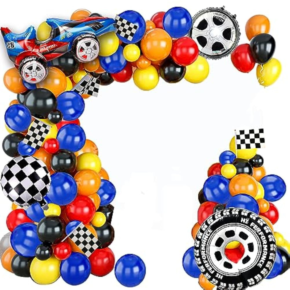 The racing car balloon arch kit includes a variety of latex balloons 12-inch balloons in blue, black, orange, yellow, and red, 10-inch balloons in the same colors, and 5-inch balloons in yellow, red, blue, and black. It also features race car aluminum foil balloons, a 16-ft balloon chain, and 100 glue points for easy assembly. Made from high-quality natural latex, these balloons are thick, durable, and non-toxic. The kit is simple to assemble using the provided tools, allowing you to create a stunning balloon garland with vibrant colors and race car-themed elements. Perfect for birthdays, weddings, baby showers, racing-themed parties, and anniversaries, this kit adds excitement to any celebration. Hang it from the ceiling, attach it to a wall, or use it as a party backdrop for a dynamic and festive display.