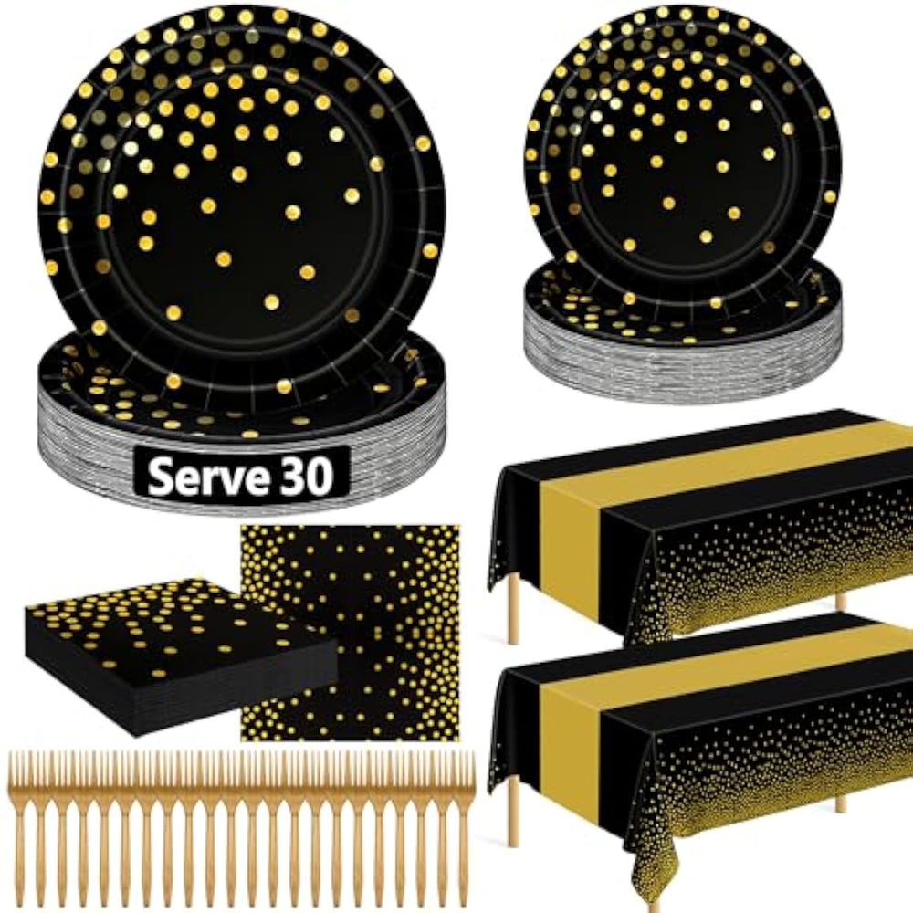 | Package Includes: You’Ll Find 30 Pcs New Years Eve Party Plates Plates (9-Inch), 30 Pcs Nye Plates Plates (7-Inch), 30 Pc Napkins (6.5-Inch), 30 Pcs Plastic Forks (6.2-Inch), And 2 Pcs Showstopping 54" X 108" Festive Tablecloth To Deck Out Your Entire Spread. | | Classical Dot Design: Adorned With Shimmering Gold Dots On A Sleek Black Backdrop, Our Happy New Year Plates Exude An Elegant And Luxurious Vibe. The Matching Tablecloths And Napkins Elevate The New Years 2026 Decorations Sophistication. | | Disposable For Convenience: After Use, Simply Toss These New Years Eve Party Plates To Avoid Post-Party Dishwashing And Tiresome Cleaning. You'Ll Have More Time To Celebrate And They Pair Perfectly With Your Preferred New Years Eve Party Supplies. | | Quality Materials: Crafted From High-Grade Paper, The Nye Plates And Napkins Set Are Sturdy (No Fading, Leaking, Or Breaking), And The Napkins Are Soft. The Tablecloth And Forks Are Made Of Non-Toxic Plastic, With The Tablecloth Being Tear-Resistant. | | Multi-Occasion Versatility: These Happy New Year Plates And Napkins Are Suitable For Birthday Parties, Family Dinners, And Outdoor Events. Our New Years Eve Party Plates And Napkins Great For Both Indoor And Outdoor Gatherings. | |