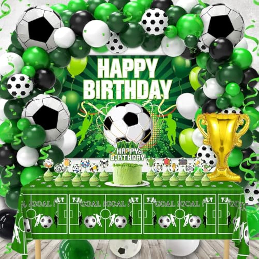 Celebrate your soccer fan’s big day with this 122PCS Soccer Party Decoration Set! It includes everything you need: a 5x3 ft "Happy Birthday" backdrop, a soccer-themed tablecloth (87x51"), 104 latex and foil balloons, 16 fun cake toppers, glue dots, and a balloon chain for easy setup. Featuring bold soccer designs, this set is perfect for boys, teens, or adult fans. Made from safe, durable materials like polyester, plastic, and latex, it's ideal for indoor or outdoor use. Great for DIY balloon arches, photo backdrops, and creating a festive game-day vibe!