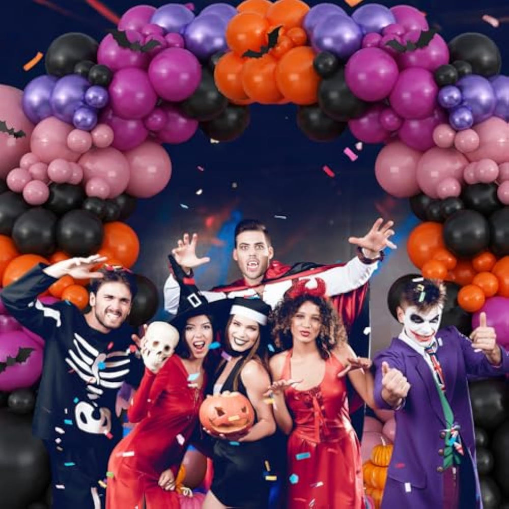 This Halloween balloon arch kit includes 123 pieces, featuring balloons in sizes 18", 10", and 5" in black, orange, pale pink, dark pink, and purple, along with a balloon chain, glue dots, and 3D bat stickers for a haunting effect. Made from durable latex, the balloons are strong, stretchy, and reusable, suitable for filling with either air or helium. The bat stickers add an extra spooky touch, perfect for enhancing walls, arches, or balloon clusters. Easy to assemble, this set is ideal for kids’ parties, themed weddings, haunted house setups, fall festivals, trick-or-treat gatherings, and photo backdrops, creating a festive and eerie atmosphere. For best results, keep balloons away from heat and sharp objects to avoid accidental popping.