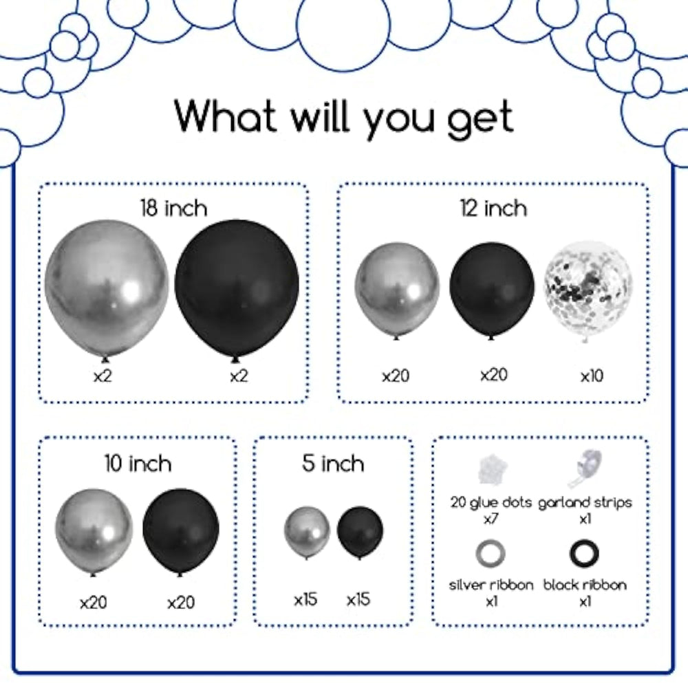 This 124-piece black and silver balloon garland kit includes a variety of balloon sizes, silver confetti balloons, garland strip, glue dots, and ribbons—everything you need to create a stunning arch or backdrop. Made from high-quality, non-toxic latex, the balloons are durable and can be filled with air or helium. The black and silver color scheme adds elegance and sophistication, making it ideal for weddings, birthdays, graduations, engagements, baby showers, and more. Easy to assemble with included tools, it’s perfect for creative DIY party decor.
