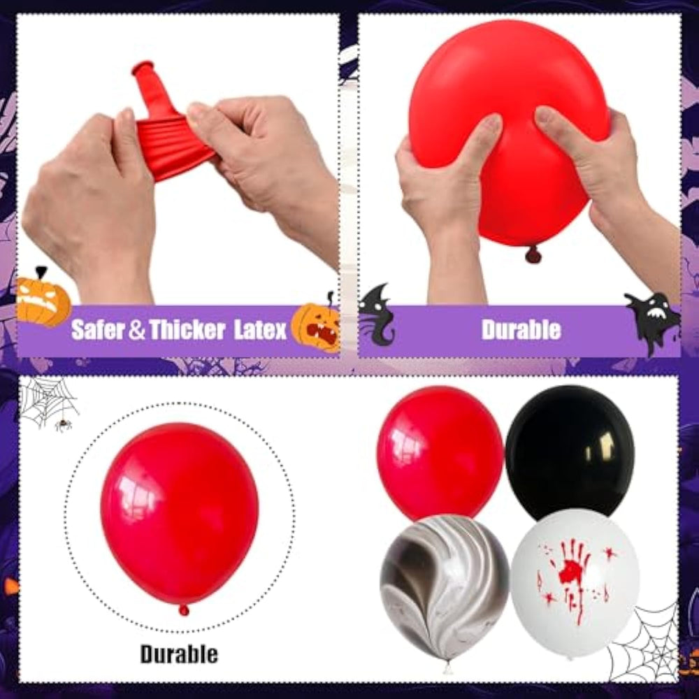 Elevate your spooky celebrations with this Bloody Halloween Balloons Garland Arch Kit, featuring a mix of matte red and black balloons, 12-inch bloody hand print balloons, and marble black accents, complete with 100 glue dots and 5-meter balloon string for easy setup. Made from 100% natural latex, these thick, durable balloons are safe, long-lasting, and perfect for indoor Gothic Halloween décor or photo backdrops. The kit is simple to assemble: inflate the balloons with air or helium, attach them to the included balloon strips, and create your favorite garland shapes in minutes. Ideal for Halloween costume parties, spooky birthdays, trick-or-treat setups, haunted house décor, or “Nightmare Before Christmas” themes, this versatile set transforms any space into a chillingly festive scene while providing fun, interactive DIY decorating for family and friends.