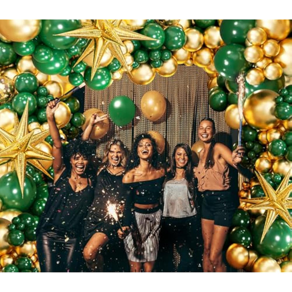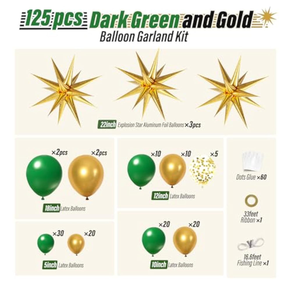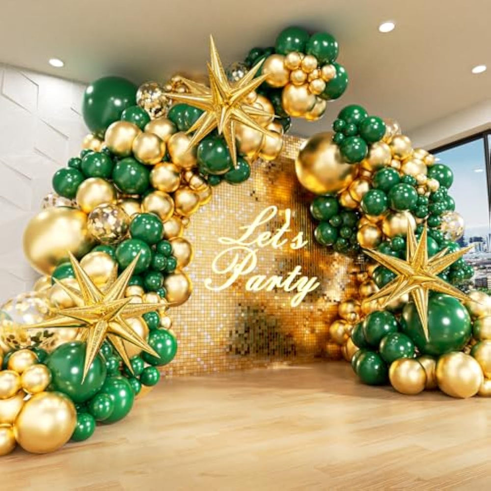 This green and gold balloon garland kit includes 62 dark green balloons in various sizes, 52 metallic gold balloons, 5 gold confetti balloons, and 3 gold star balloons, along with ribbon, glue dots, and a decorative strip for easy assembly. Made from high-quality latex, these balloons are durable and can be filled with air or helium. A balloon pump is recommended for quick inflation, but avoid overfilling. The kit includes essential tools to effortlessly create a stunning balloon arch, making it perfect for birthdays, weddings, baby showers, and festive celebrations.