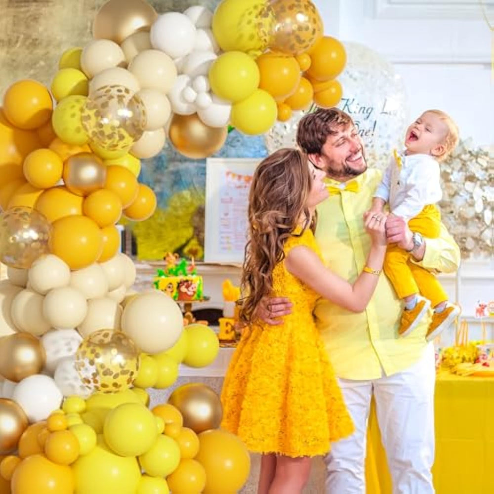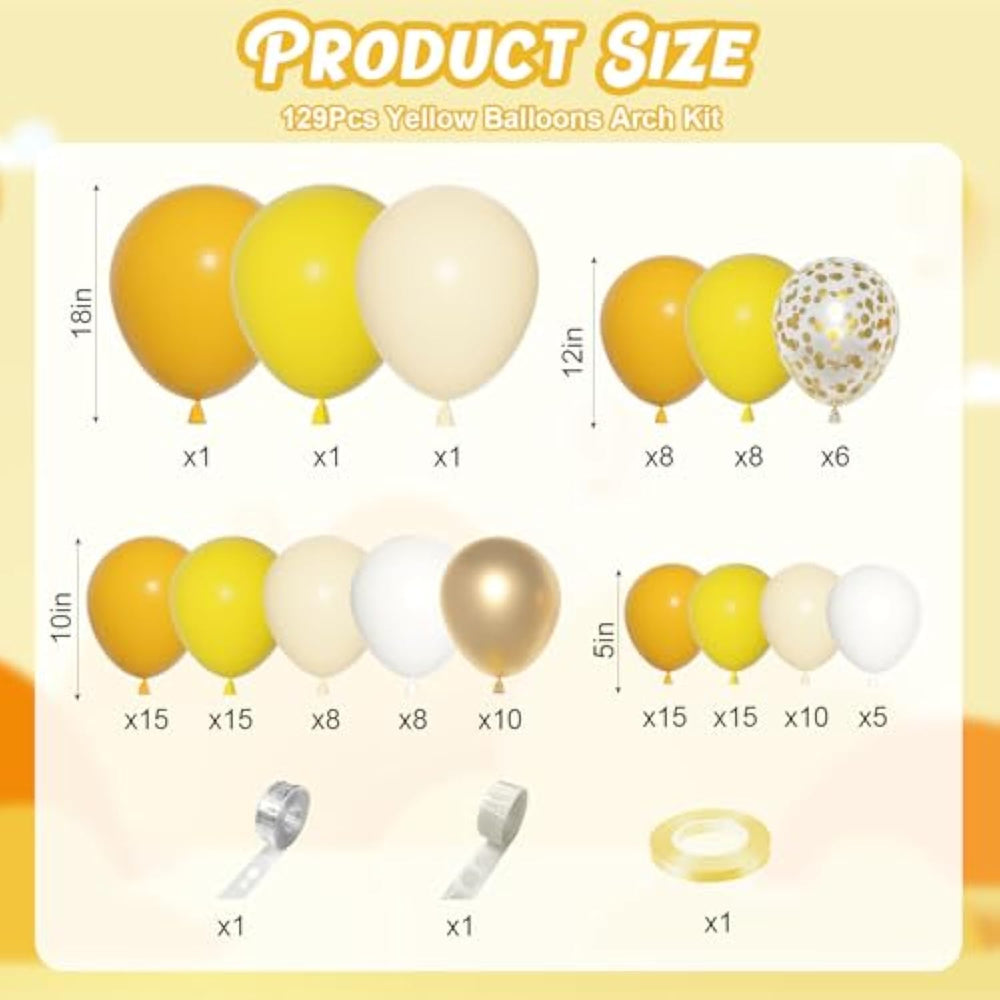 The Yellow Balloon Arch Kit includes 3pcs 18-inch balloons (mustard yellow, yellow, ivory), 22pcs 12-inch latex and confetti balloons (mustard yellow, yellow, gold), and 101pcs 10/5-inch balloons (mustard yellow, yellow, ivory, white, metallic gold), along with 3 balloon tools for easy assembly. Made from premium latex, these balloons are long-lasting and non-toxic, perfect for both indoor and outdoor use. Whether you're hosting a bee-themed baby shower, sunflower birthday party, or any other celebration, these yellow balloons will create memorable moments and stunning photo opportunities for your guests. With everything you need for quick and easy setup, including balloon inflation tools, assembling a beautiful yellow balloon arch has never been simpler.