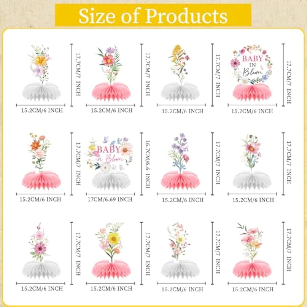 You will receive a set of 12 floral honeycomb centerpieces featuring a baby in bloom theme, beautifully decorated with charming wildflowers and the phrase "baby in bloom" to highlight the celebration. These decorations are perfect for baby showers, gender reveal parties, and other joyful occasions, bringing a fresh and elegant floral vibe to your event. Made from high quality paper material, they are sturdy and visually appealing. Assembly is quick and easy—just unfold each piece and secure the honeycomb base to the designated area. For added stability, you can use paper clips if needed, making setup simple and stress-free.
