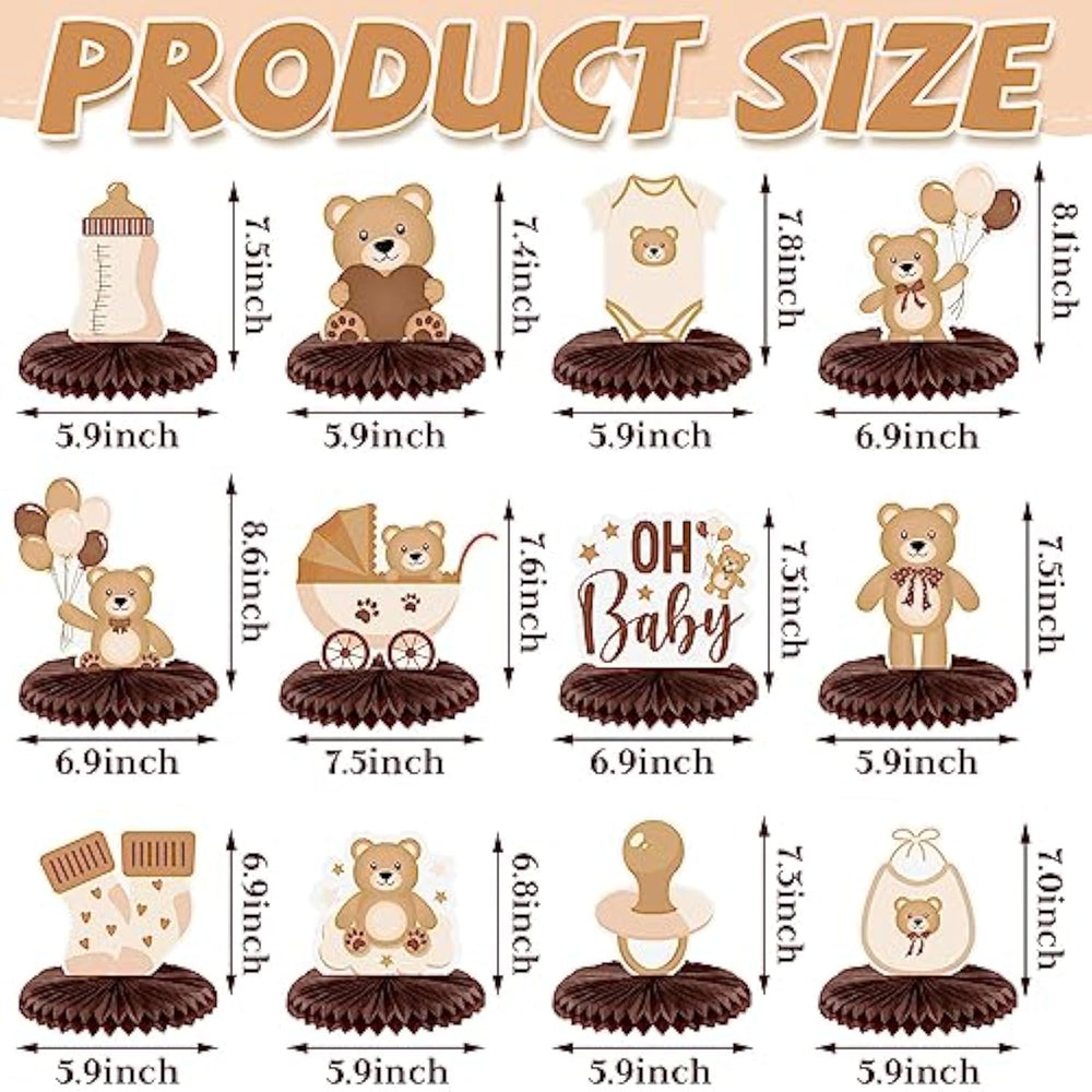 This set includes 12 bear honeycomb centerpieces in various designs such as a bear, baby bottle, bib, pacifier, baby carriage, and more, each representing warmth and love for the upcoming baby. These adorable, neutral-colored decorations are perfect for creating a warm, natural atmosphere at a baby shower. Made from high-quality card paper, they are durable, with clear printing that resists fading, ensuring they remain beautiful for long-term use. Easy to assemble, simply peel off the sticker, attach the honeycomb ball to the card, and enjoy quick and effortless setup for your party decorations.
